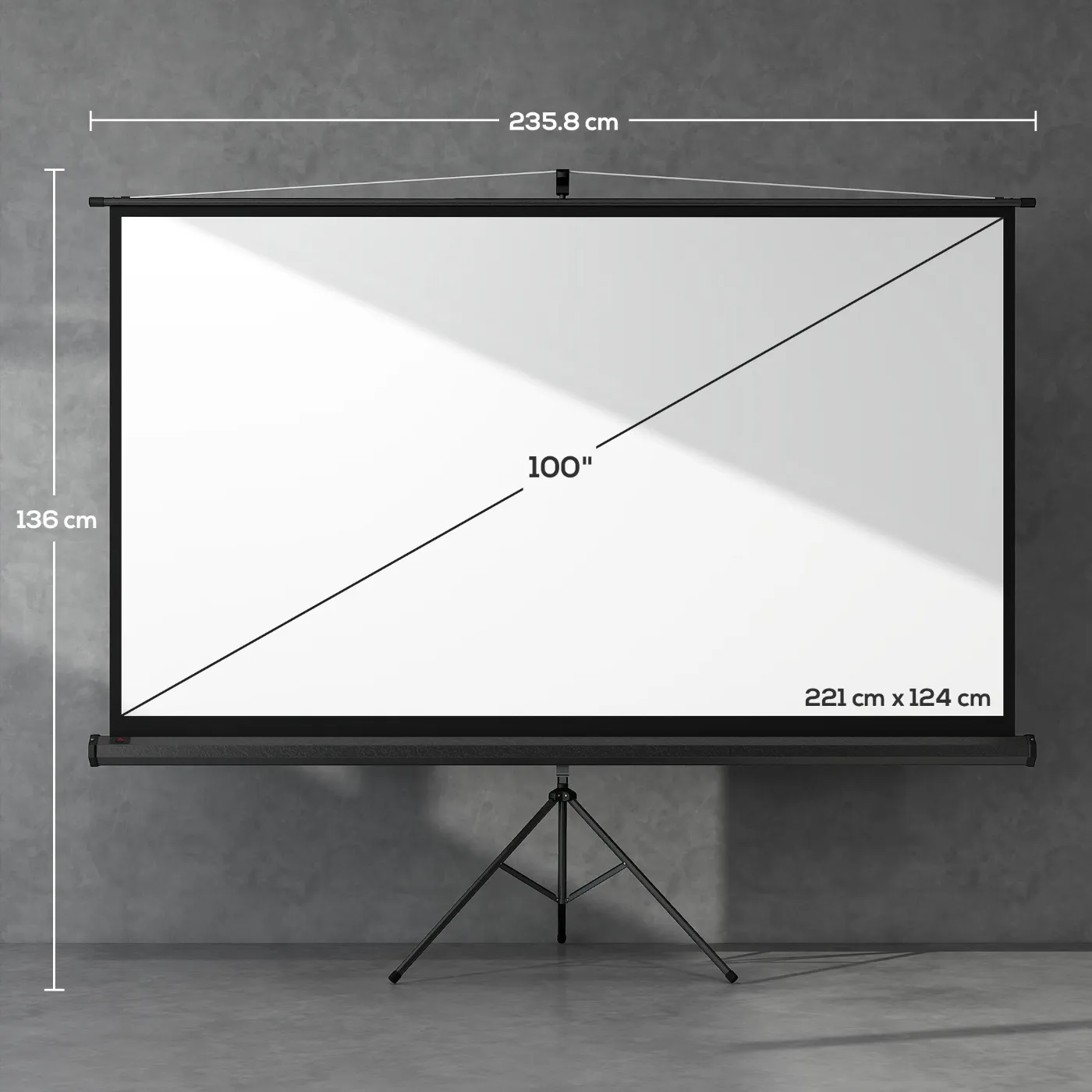 - DIMENSIONS: Overall dimensions: 235.8W x 8D x 136H cm. Screen dimensions: 221W x 124H cm. Aspect ratio: 16:9. Diagonal: 100 inches