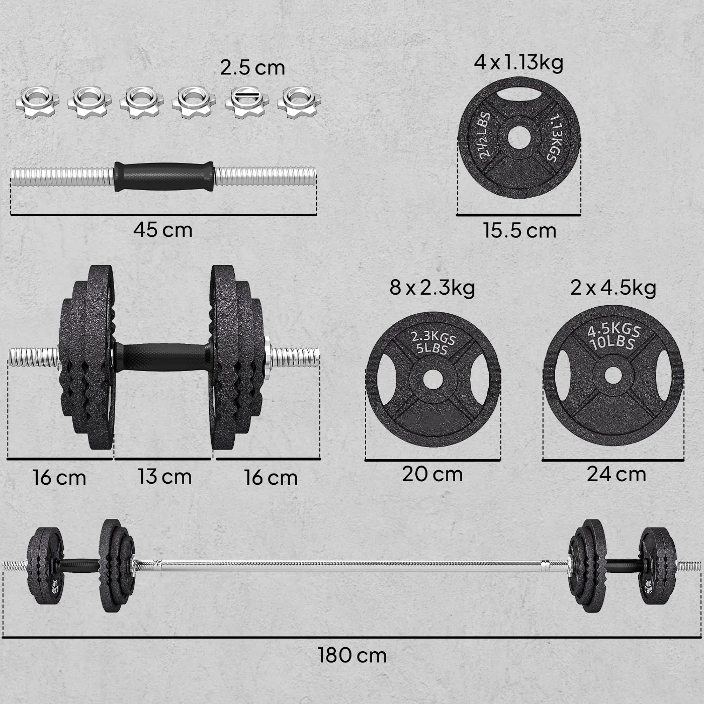 - ADJUSTABLE WEIGHTS: Our 42kg total dumbbell set consists of 2 x 4.5kg, 8 x 2.3kg and 4 x 1.13kg plates, 2 dumbbell bars, a barbell bar and 6 secure screw locks, ideal for home exercise