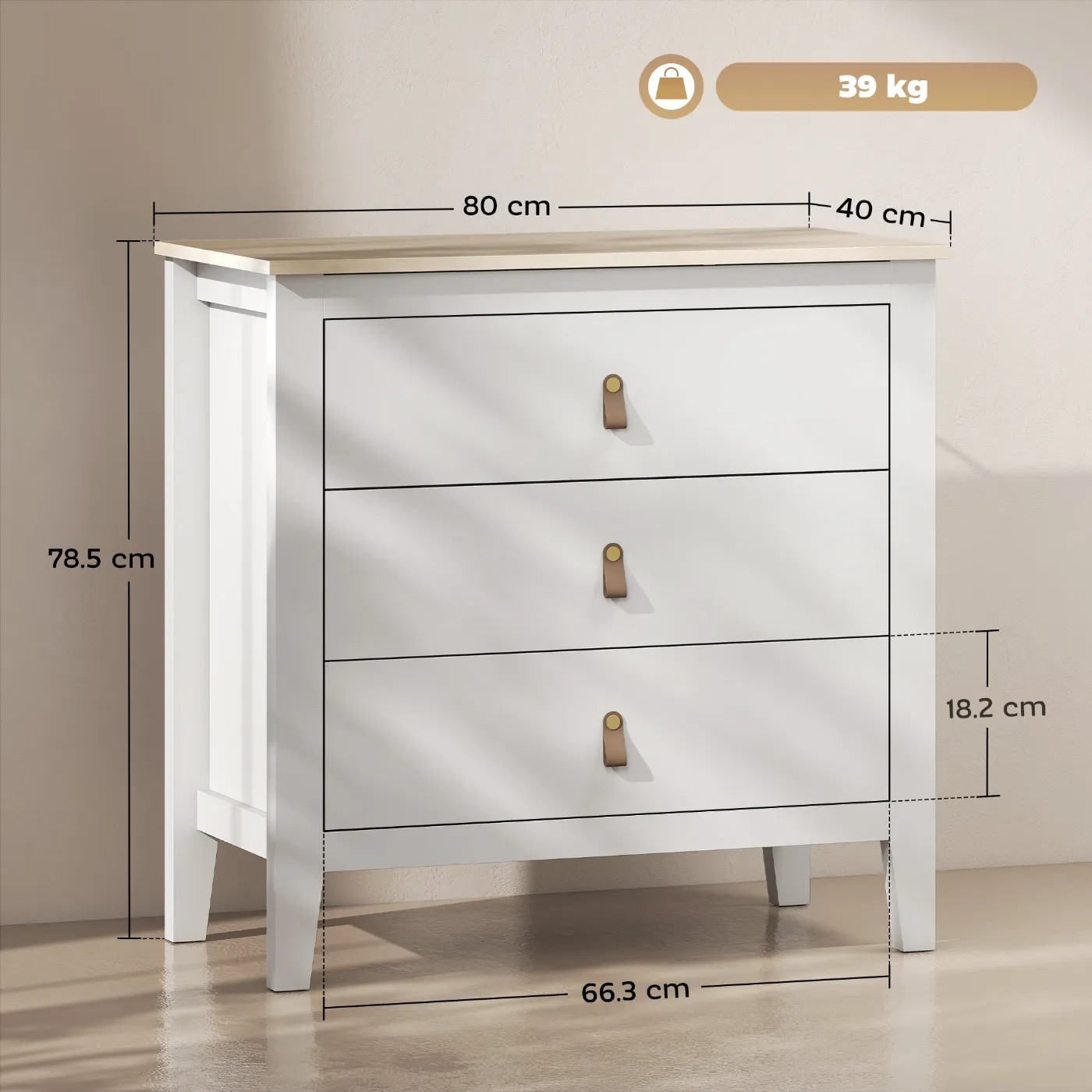 - • Weight capacity: 8 kg (drawer), 15 kg (top shelf), 39 kg (total)
