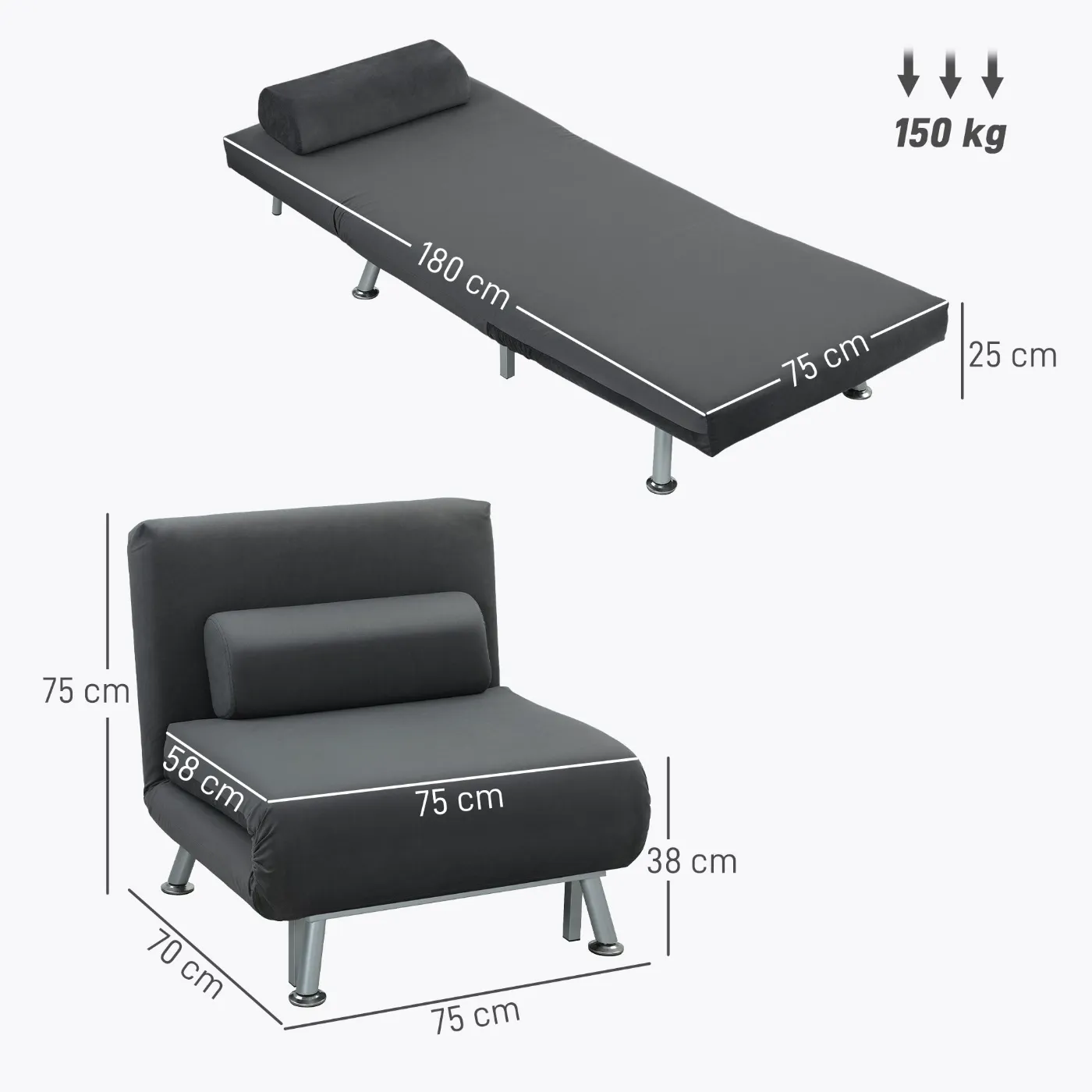 - DIMENSIONS: Overall dimensions: 75W x 70D x 75H cm (chair mode), 180W x 75D x 25H cm (bed mode)