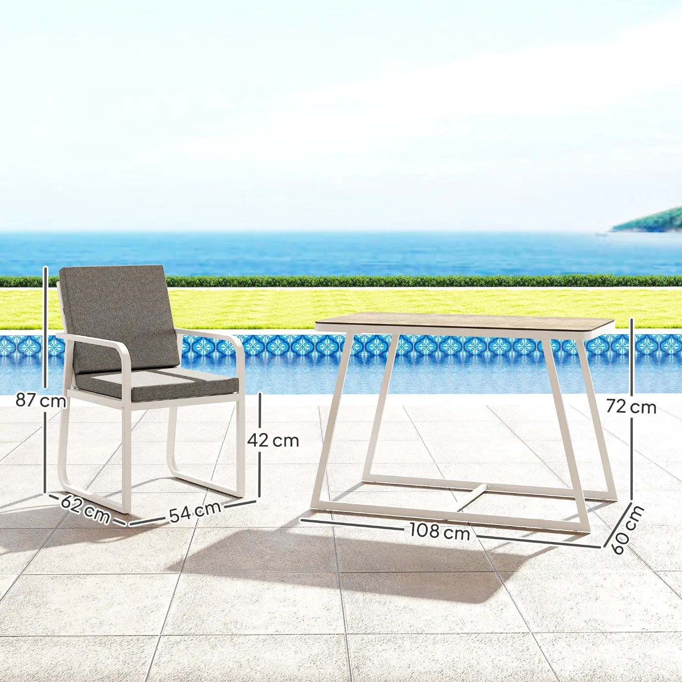 - STURDY CONSTRUCTION: Thanks to the powder-coated steel frame, this garden table and chair set guarantees resistance and durability in all weather conditions, from rain to sun, to enjoy your garden with peace of mind.