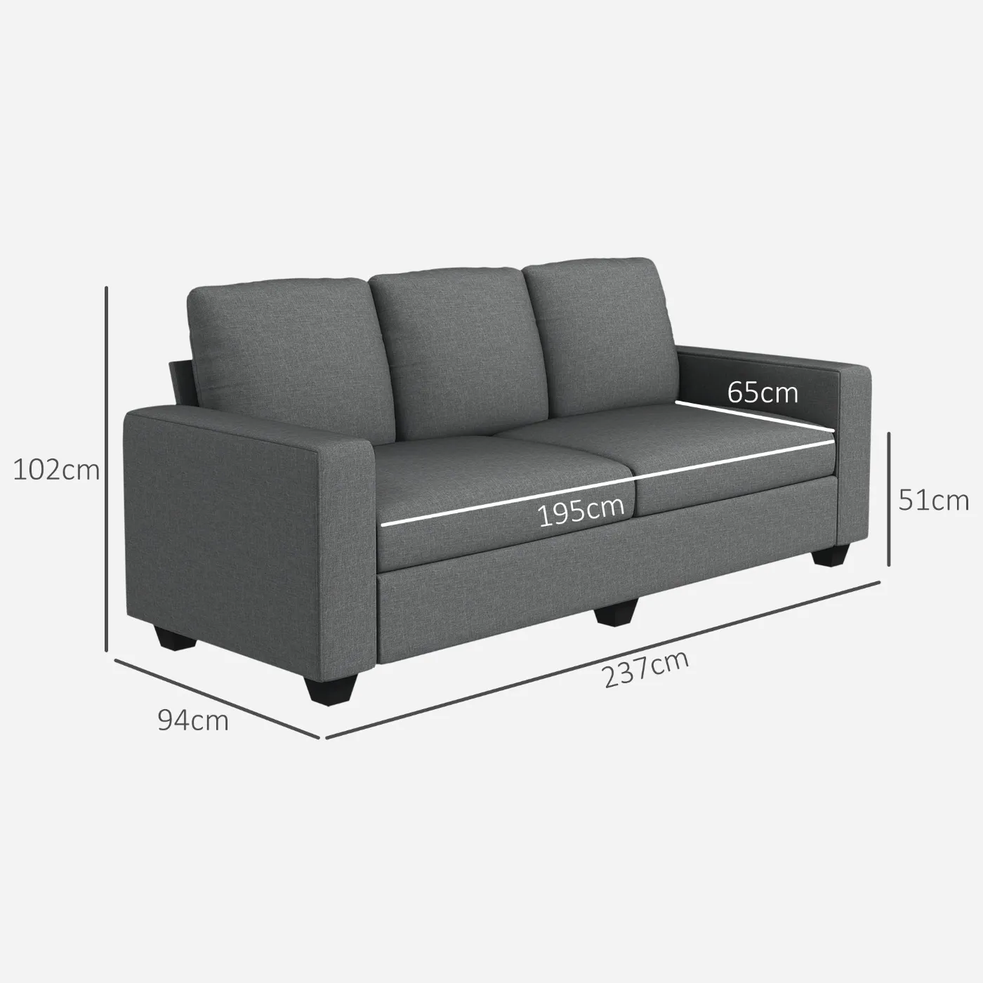 - DIMENSIONS: Overall dimensions: 237W x 94D x 102H cm. Seat dimensions: 195W x 65D x 51H cm. Assembly required