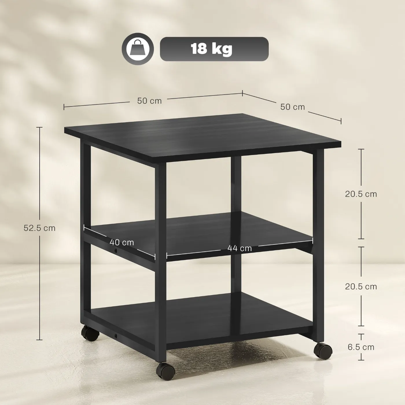 - DIMENSIONS: Overall dimensions: 50W x 50D x 52.5H cm. Weight capacity: 18 kg (total), 8 kg (top tier), 5 kg (shelf)