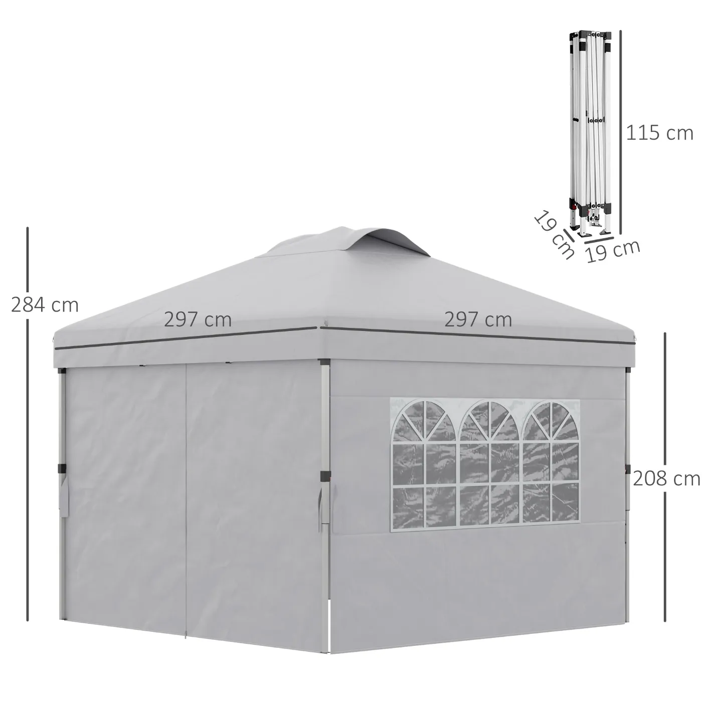 - DIMENSIONS: Overall dimensions: 297L x 297W x 284H cm. Do not leave the gazebo unattended and dismantle it in bad weather. Always use the pegs and guy ropes provided to ensure maximum safety of the party gazebo
