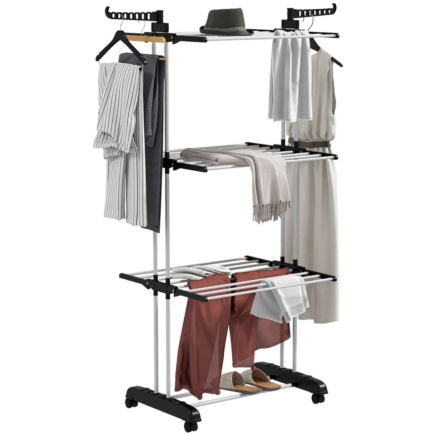 - • 4-tier rack with 2 rotating side wings (14 hooks) providing a large drying area for coats and socks and a lower rack for shoes