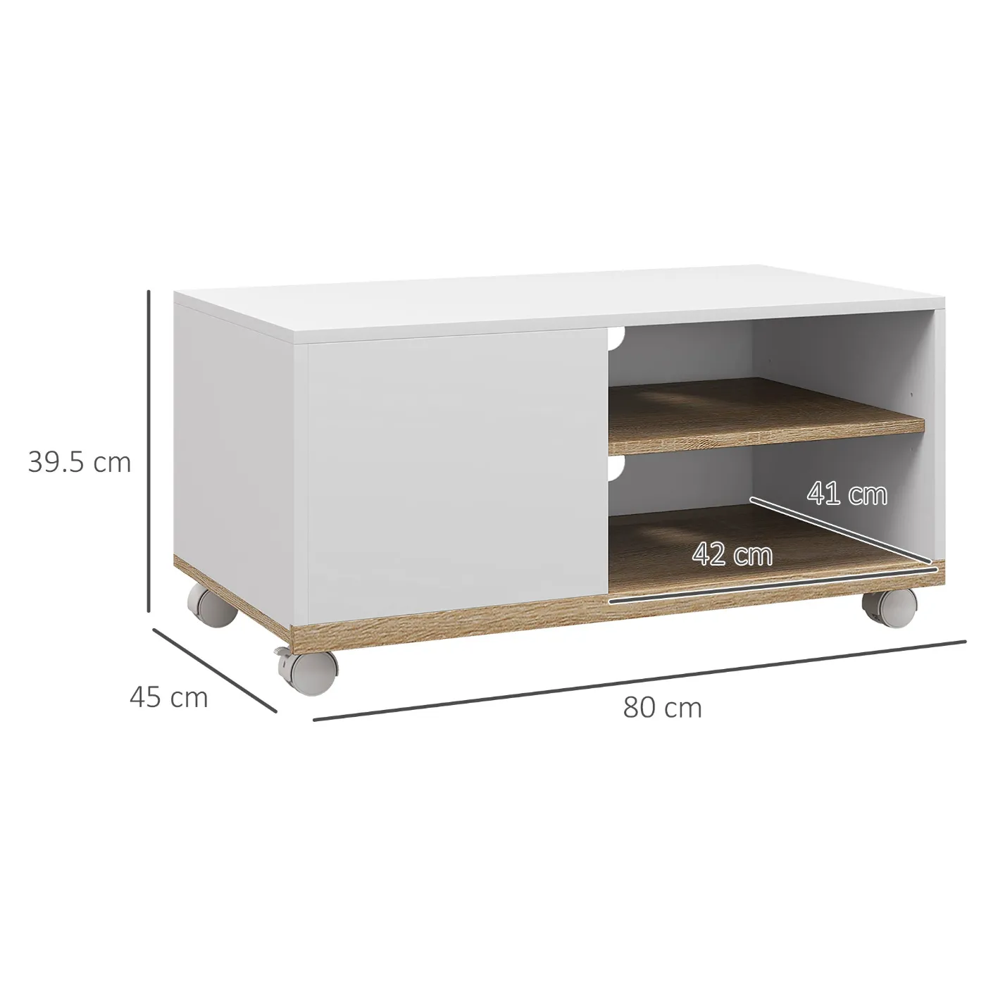 42″ Max TV Stand with 2 Open Shelves and Door and Wheels, Chipboard, 80x45x39.5 cm, White