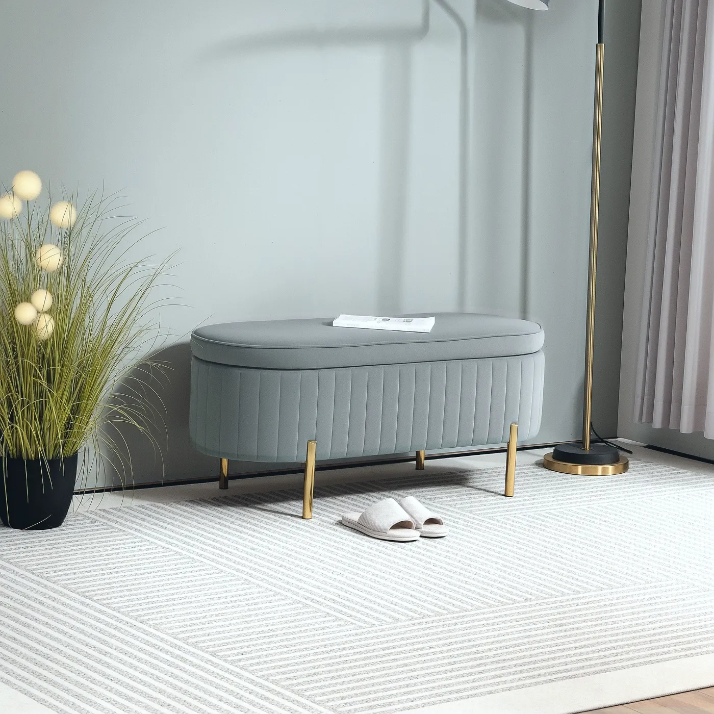72L Oval Storage Bench with Lift-Top Lid, Velvet Fabric and Wood, 108x44x43.5 cm, Grey