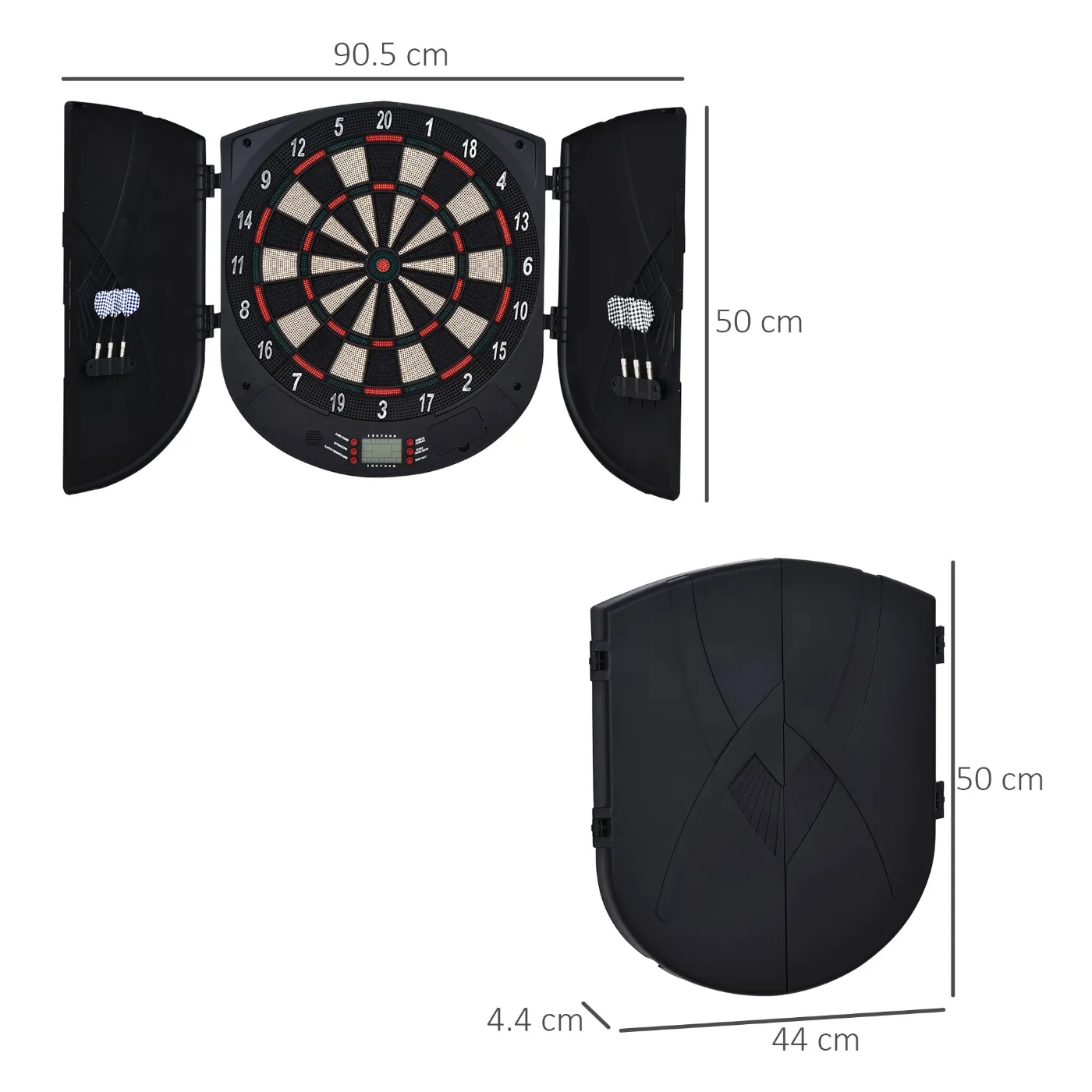 - DIMENSION: Overall Dimension: 44L x 4.4D x 50Hcm. 6 Soft Darts Included. Max 8 Players.