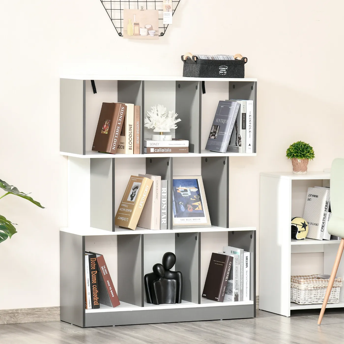 - DURABLE AND STABLE: Constructed of melamine-faced chipboard, this modern bookcase is sturdy and easy to clean. The back features an anti-tip device to secure the structure to the wall.