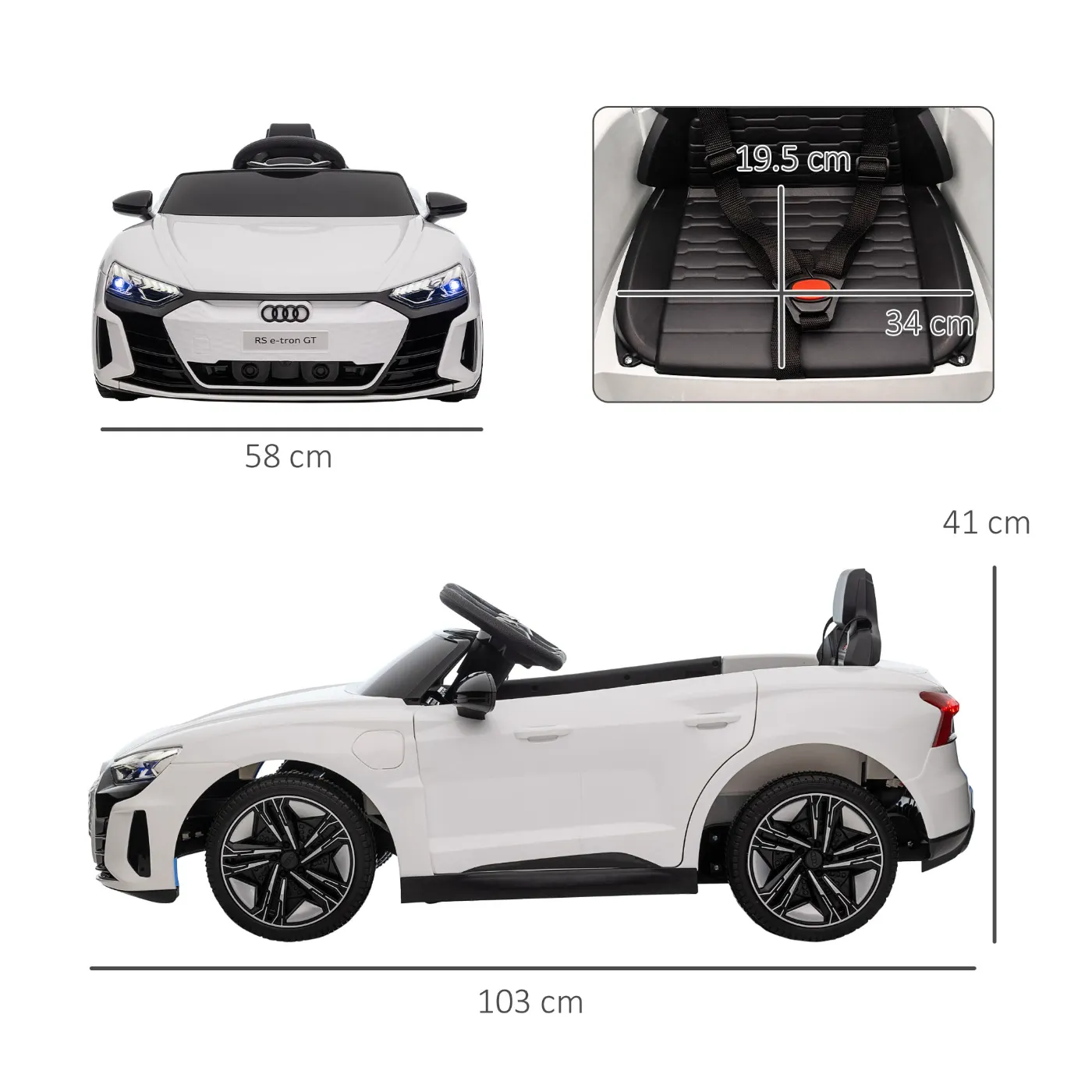 - AUDI RS LICENSED: This electric vehicle for kids is officially licensed by Audi, specifically for the RS E-tron GT model. The car features realistic details, such as LED headlights, a horn, built-in music and wheels with very real tires to give your young drivers authentic fun