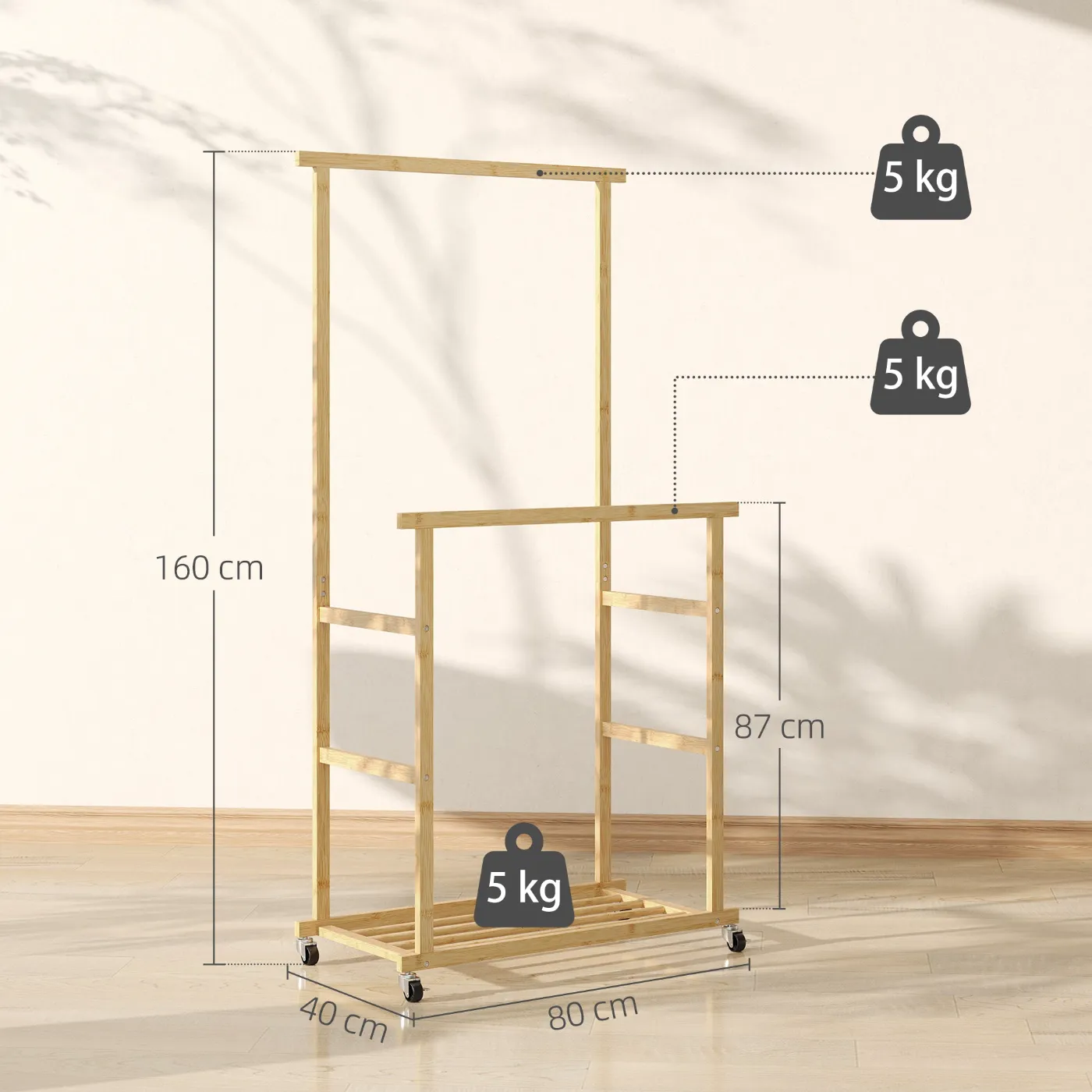 Bamboo Clothes Rail with 2 Rails, Lower Shelf and 4 Wheels, 80x40x160 cm, Natural Wood