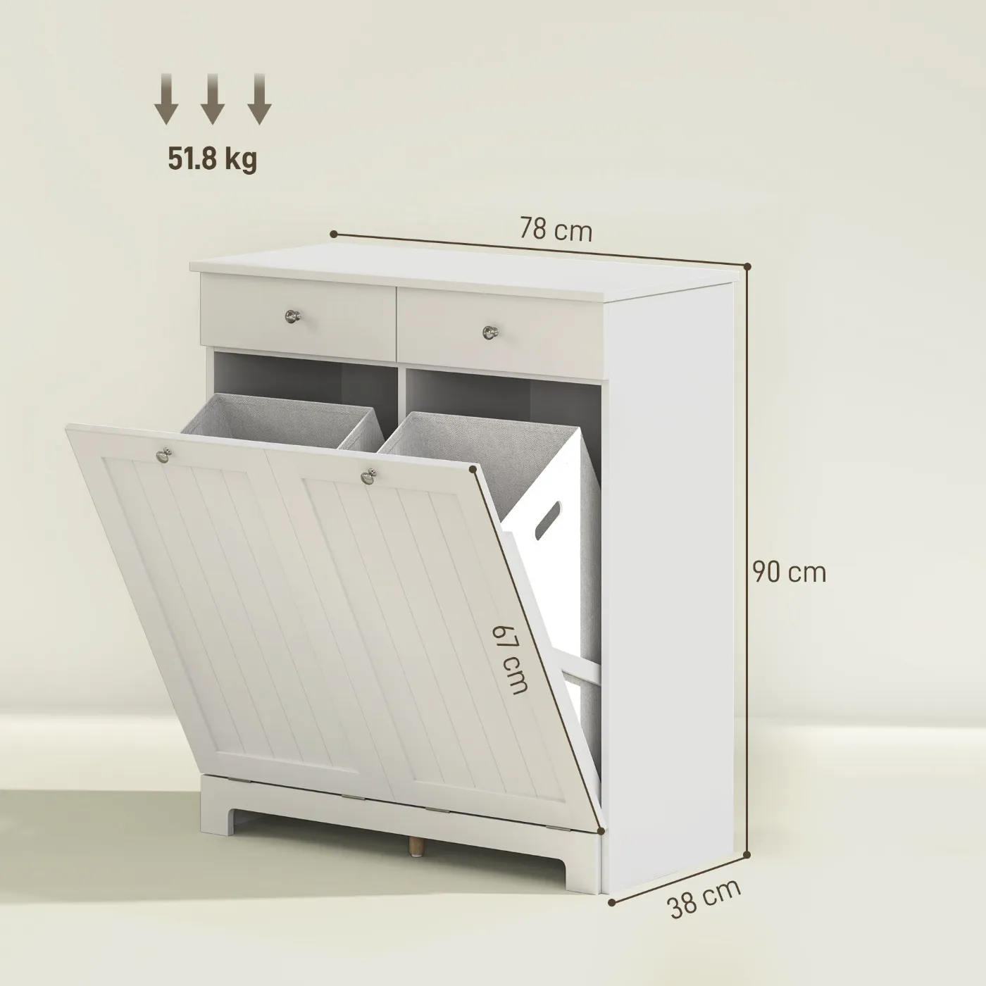 • • Two tilting laundry baskets make sorting laundry easy and keep it discreetly hidden