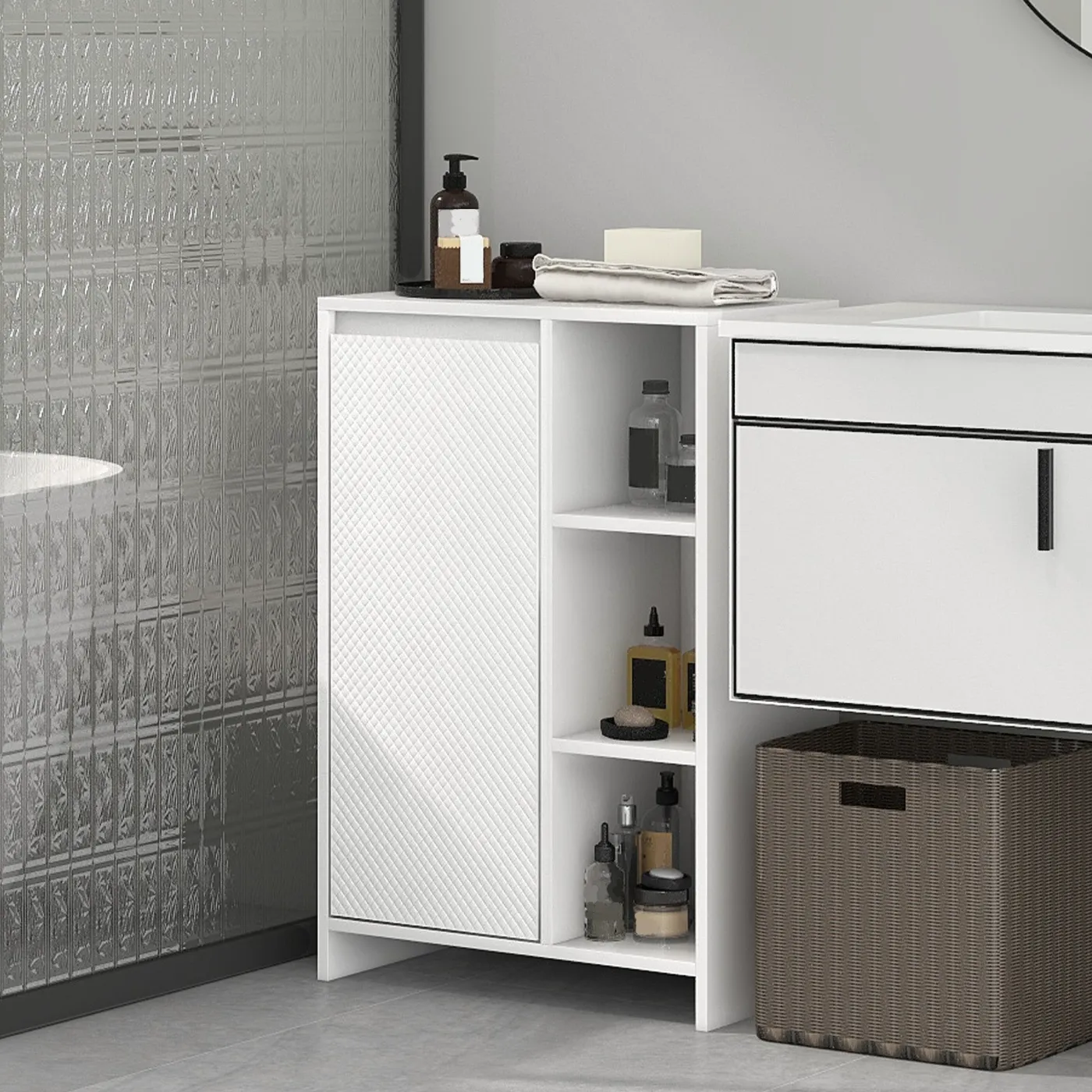 • • Bathroom cabinet with 2-tier internal space with 3-height adjustable shelf to accommodate items of different sizes
