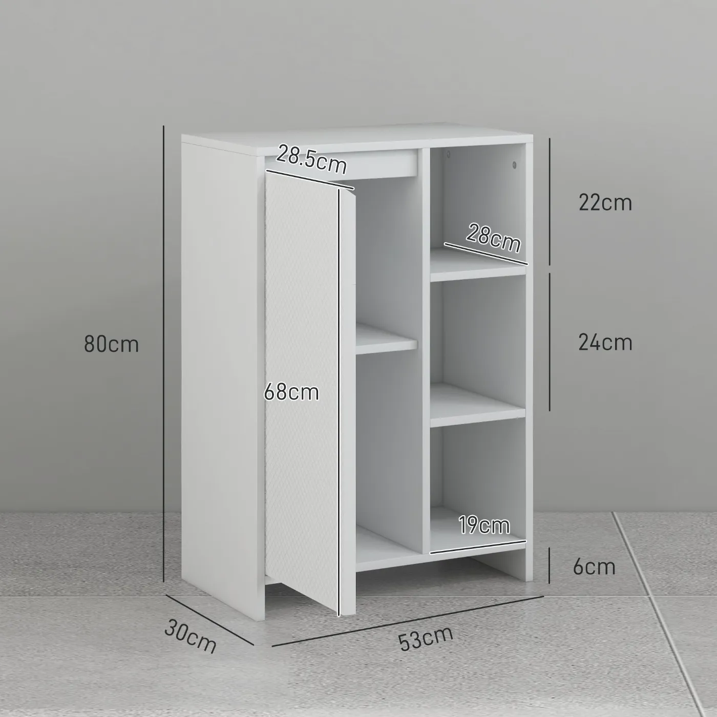Bathroom Cabinet with 3 Open Shelves and One-Door Cabinet with Adjustable Shelf, 53x30x80cm, White