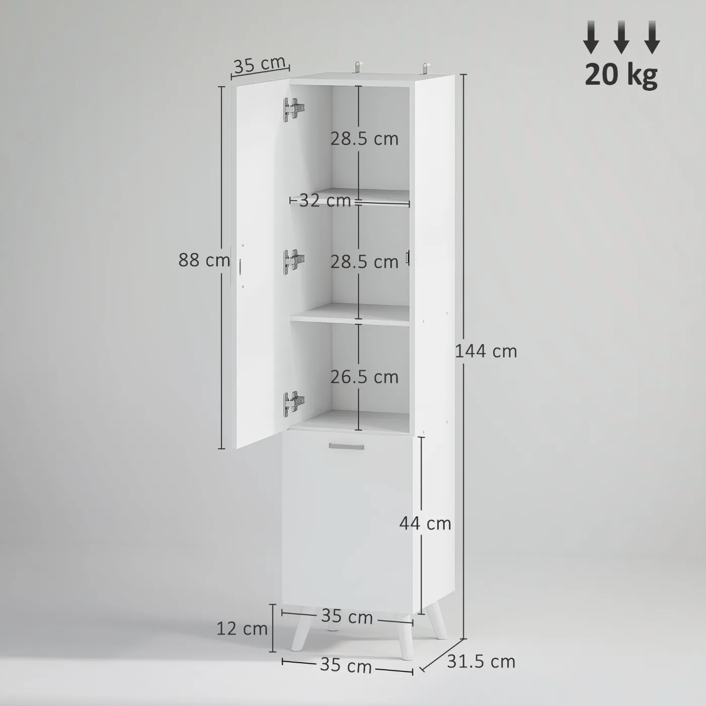 - DIMENSIONS: Overall dimensions: 35W x 31.5D x 144H cm. Weight capacity: 20 kg (total), 5 kg (per shelf), 3 kg (bottom space). Assembly required