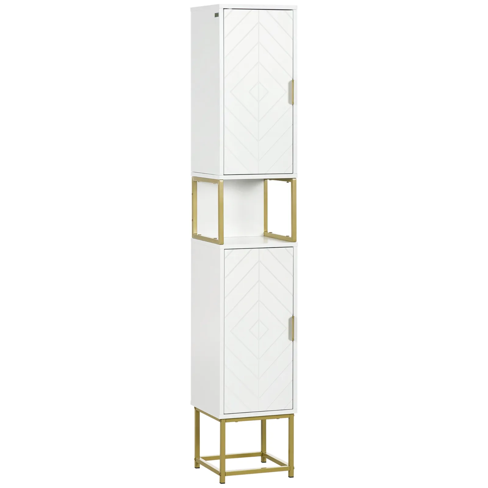 - SIMPLE AND ELEGANT: The white finish with gold metal details make this bathroom cabinet a furnishing accessory that combines practicality with style.