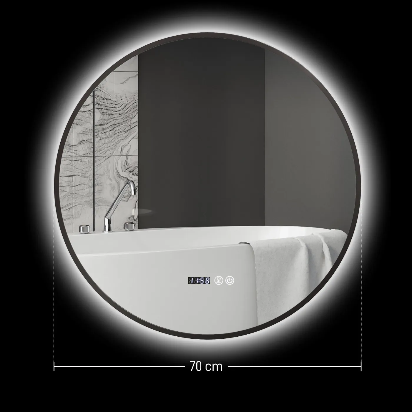 Bathroom Mirror with Adjustable LED Light, Anti-fog and Time and Temperature Display, Ø70 cm, Black
