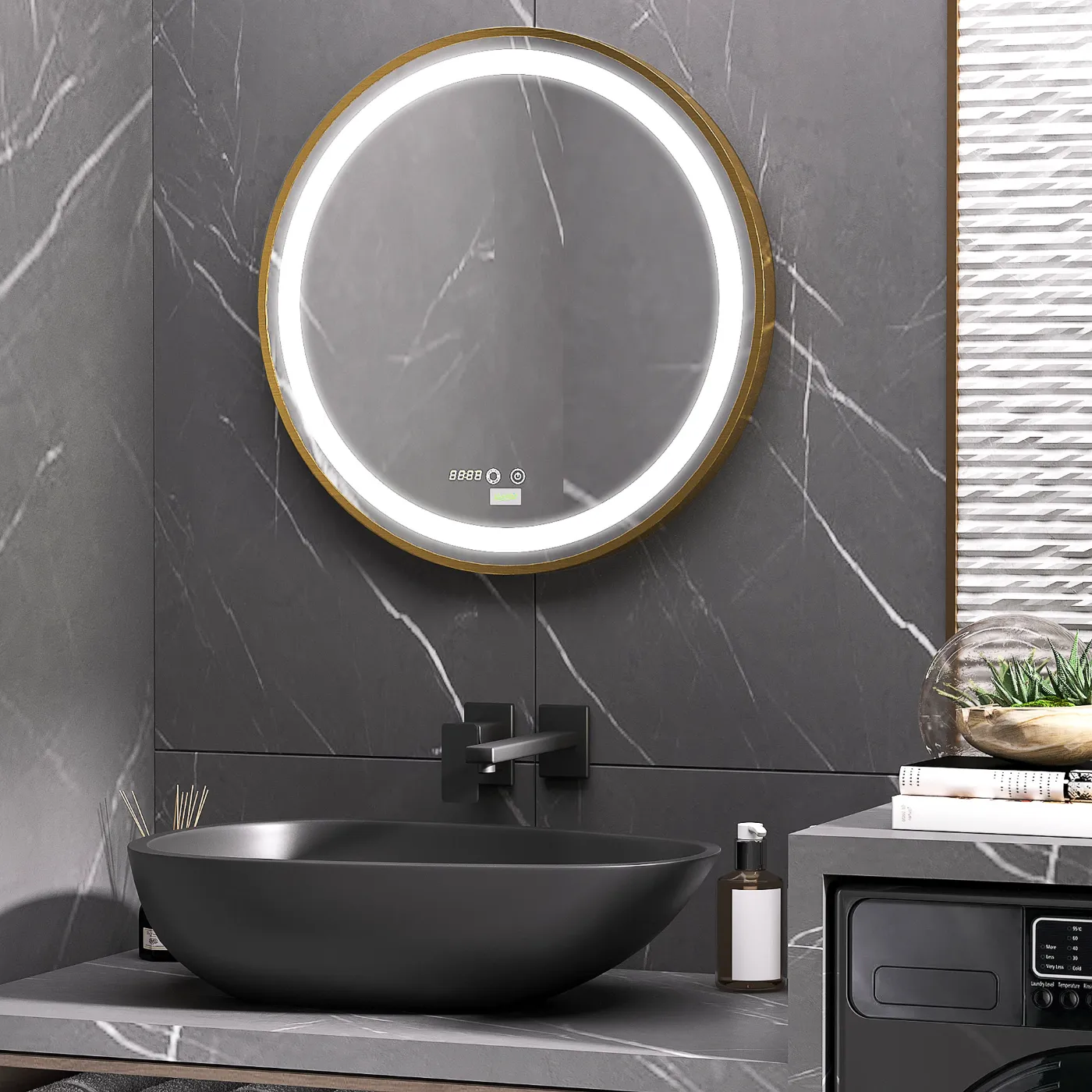 • DIMENSIONS: Overall dimensions: Ø60 x 4D cm. Assembly required. The mirror must be electrically installed to function properly.