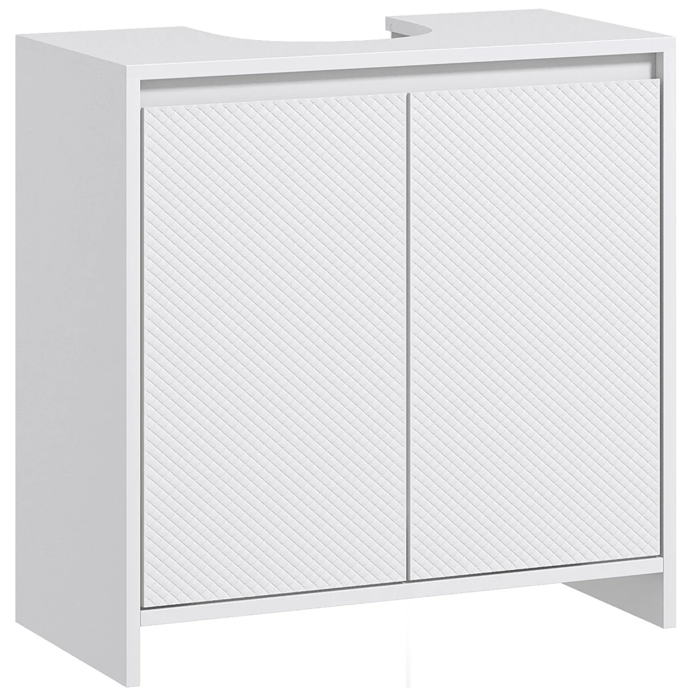Transform your bathroom with the HOMCOM vanity unit. It features two shelves and designed with a U-shaped cutout that leaves room for the pipes to sit completely under the sink. Made with doors decorated with an original diamond pattern, this bathroom cabinet will renew the style of your home by combining elegance and functionality.Features:• The two-tier cabinet maximizes space even in small bathrooms• 23 x U-shaped cutout 20cm fits sink pipes for wall or pedestal sinks • Bathroom cabinet made of painted MDF for easy cleaning and durability • Anti-tip design improves safety in use everyday• Original door panels with texture and handleless design gives the vanity unit a modern touch• Two doors with sloped top edge and hinges, for easy access to your items• Raised base prevents water damage• Assembly requiredTechnical data :• Color: White• Material: MDF• Overall dimensions: 60W x 30D x 60H cm• “U” cutout dimensions: 23W x 20D cm• Compatible sink dimensions: < 60W x 30D cm• Internal dimensions of the cabinet: 56.5W x 26D x 25/25H cm• Height of the base from the floor: 6 cm• Weight capacity: 40 kg (overall), 5 kg (shelf)Package contents:• 1 x Vanity unit• 1 x Manual