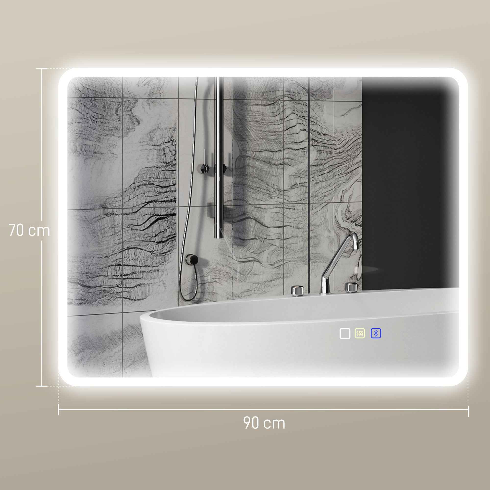 Bluetooth LED Bathroom Mirror, Touch Switch, Adjustable Light, 3 Colors, Anti-Fog, 70 x 90 cm, Silver