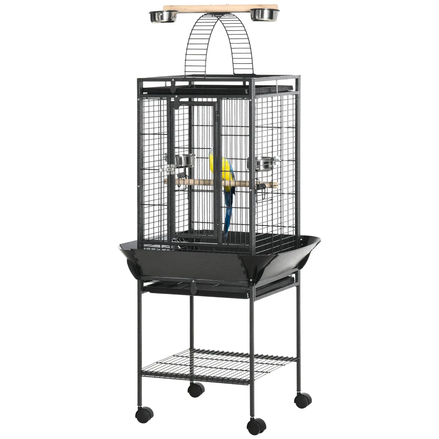 - STURDY AND DURABLE: The bird aviary is made of durable metal and solid fir wood. The base features wheels with brakes, making it easy and safe to move the cage.