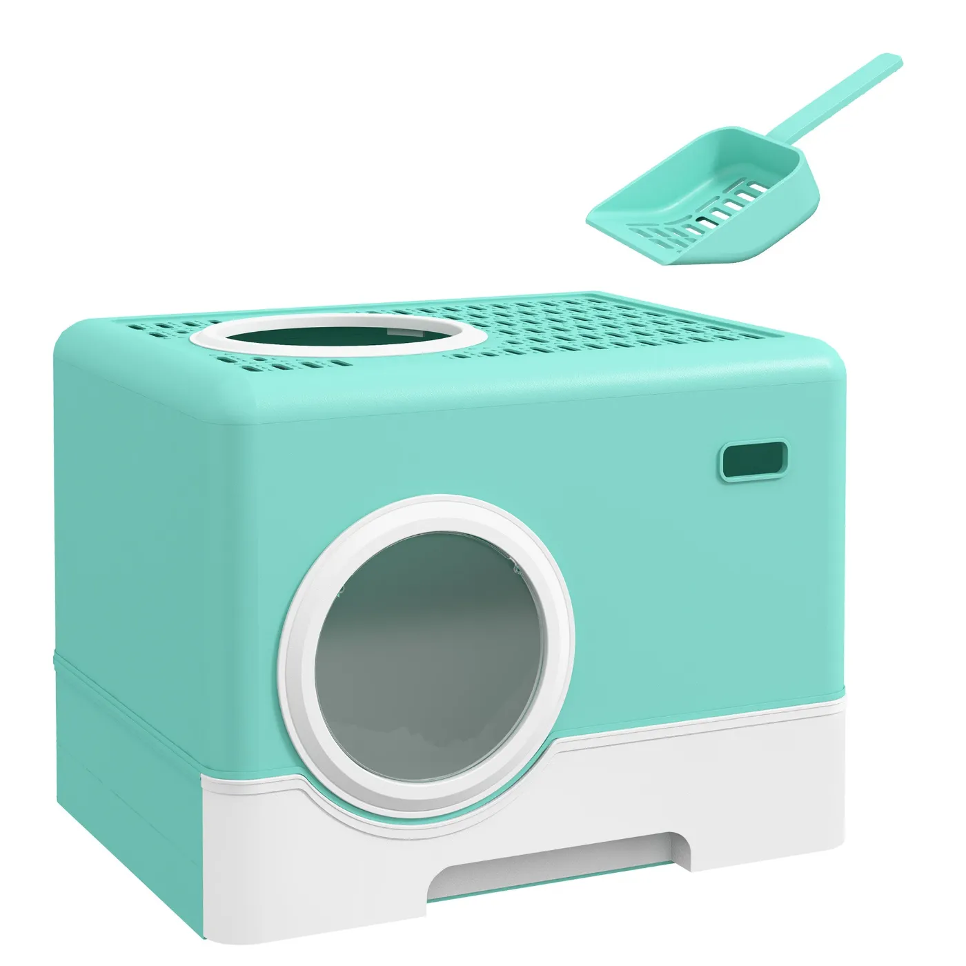 - • Convenient front entry and top exit for easy access to the litter box with lid