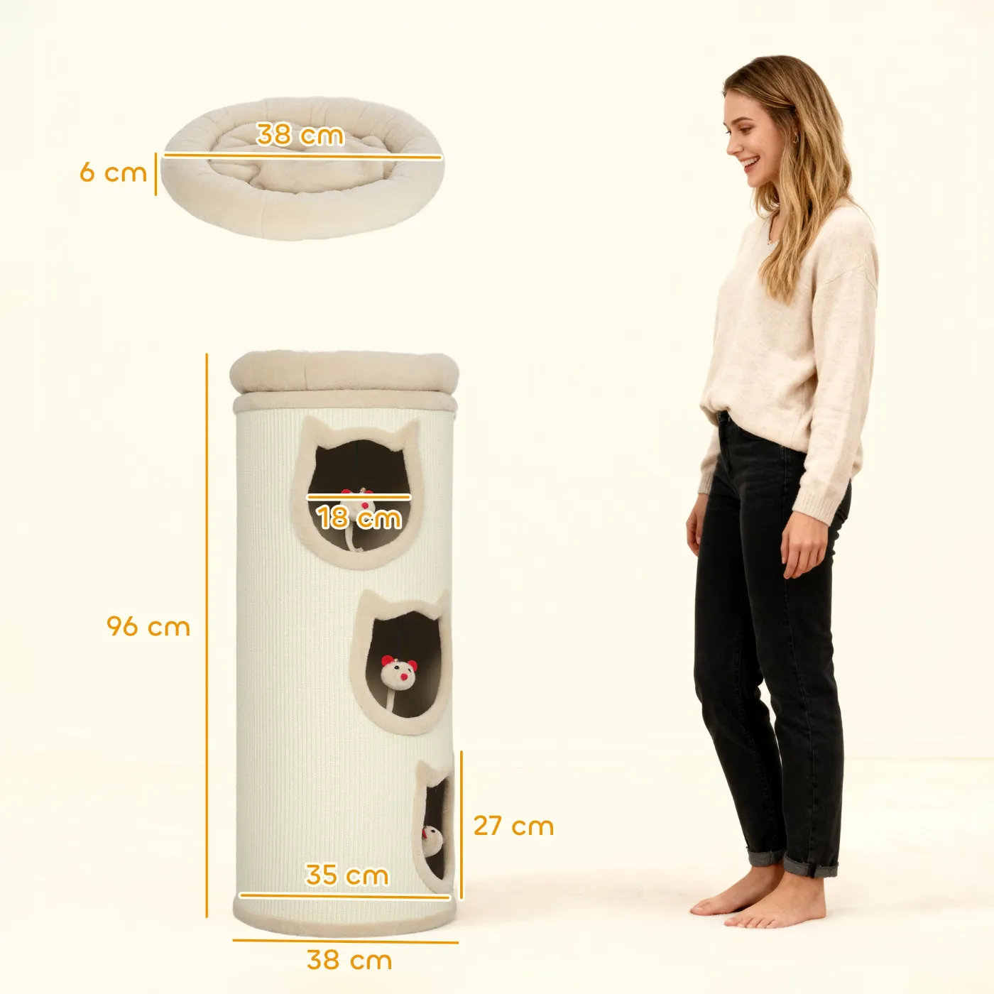 - THREE-LEVEL HIDEOUTS: This cat scratching post includes three spacious, lined houses, ideal for providing cats with a cozy, safe haven that reduces stress and provides privacy.