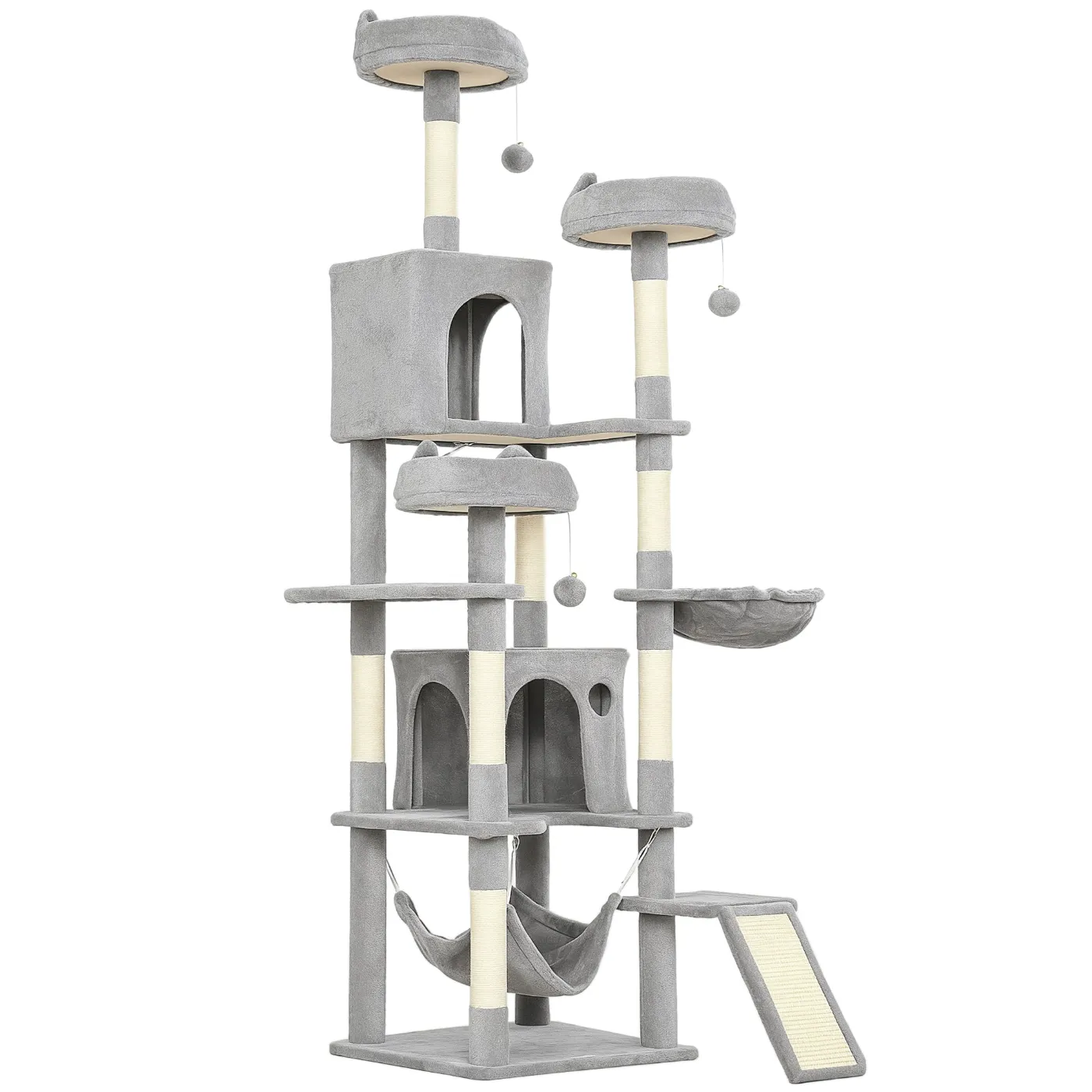 Cat Tree with Ladder, 2 Hammocks, 3 Perches, 2 Houses and 3 Platforms, 48x48x192 cm, Grey and Cream