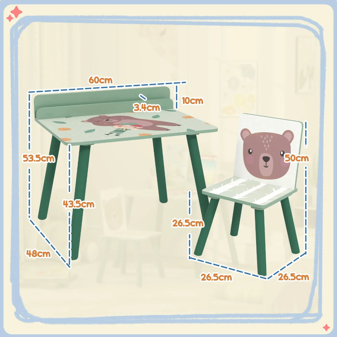 • DIMENSIONS: Overall dimensions: 60L x 48D x 53.5H cm. Chair dimensions: 26.5L x 26.5D x 50H cm. Weight capacity: 20 kg (table), 30 kg (chair). Recommended age: 3 years and up. Assembly required