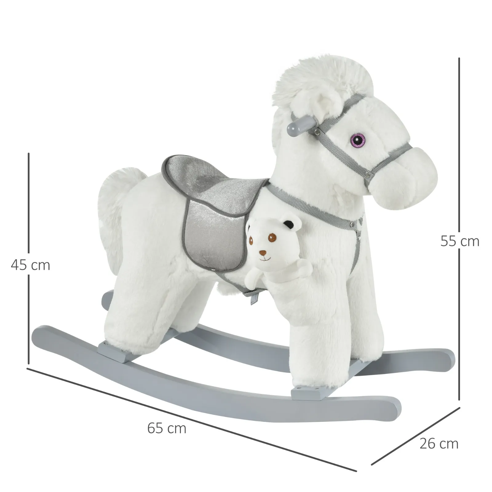 Children’s Rocking Horse in Plush and Wood with Sounds and Teddy Bear Included, for Children from 18-36 Months, 65x26x55cm, White