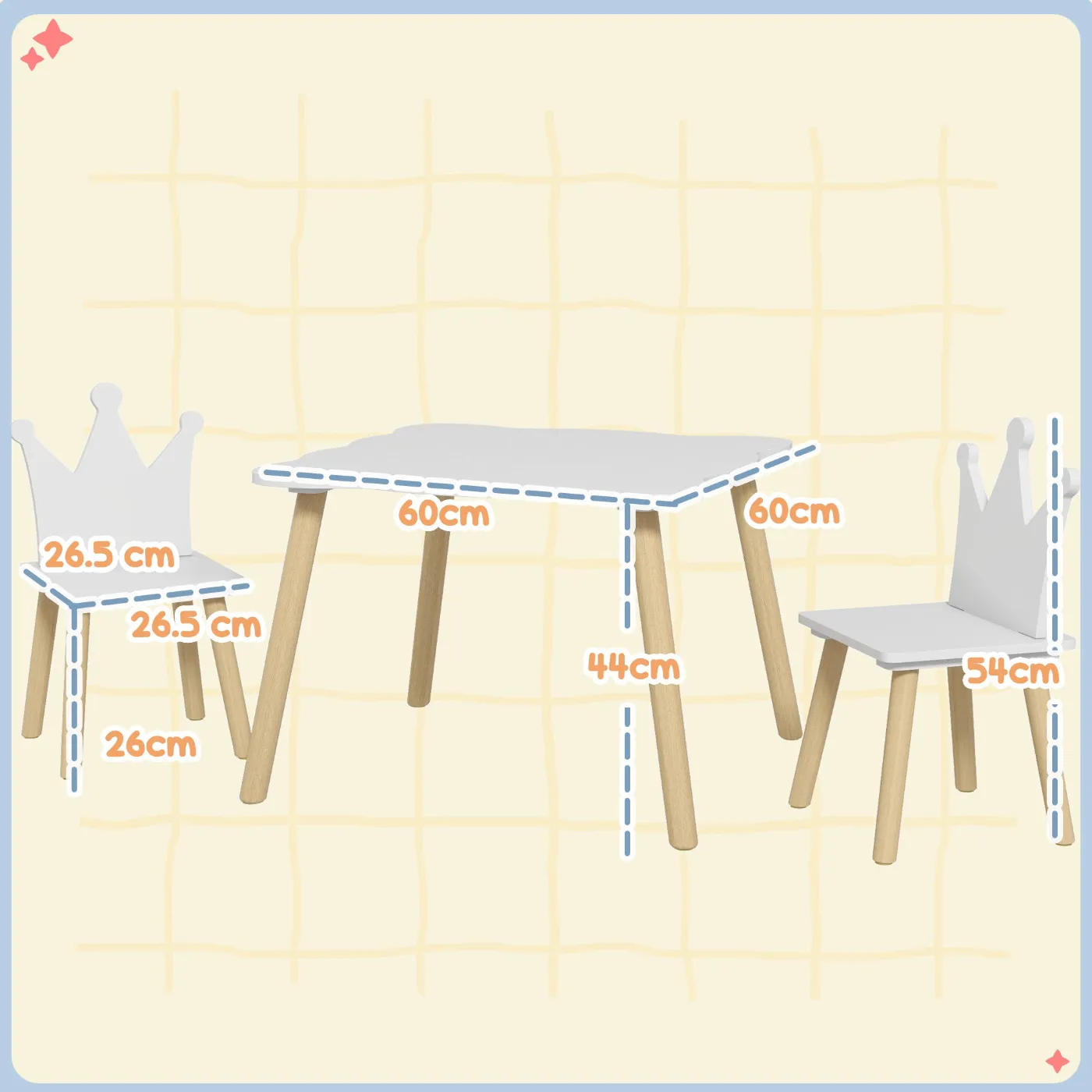• DIMENSIONS: Table: 60W x 60D x 44H cm. Chair: 26.5D x 26.5D x 54H cm. Weight capacity: Table 20 kg, Chair: 30 kg. Recommended age: 3-6 years. Certified age: 3+ years. Certifications: EN71-1-2-3. Assembly required