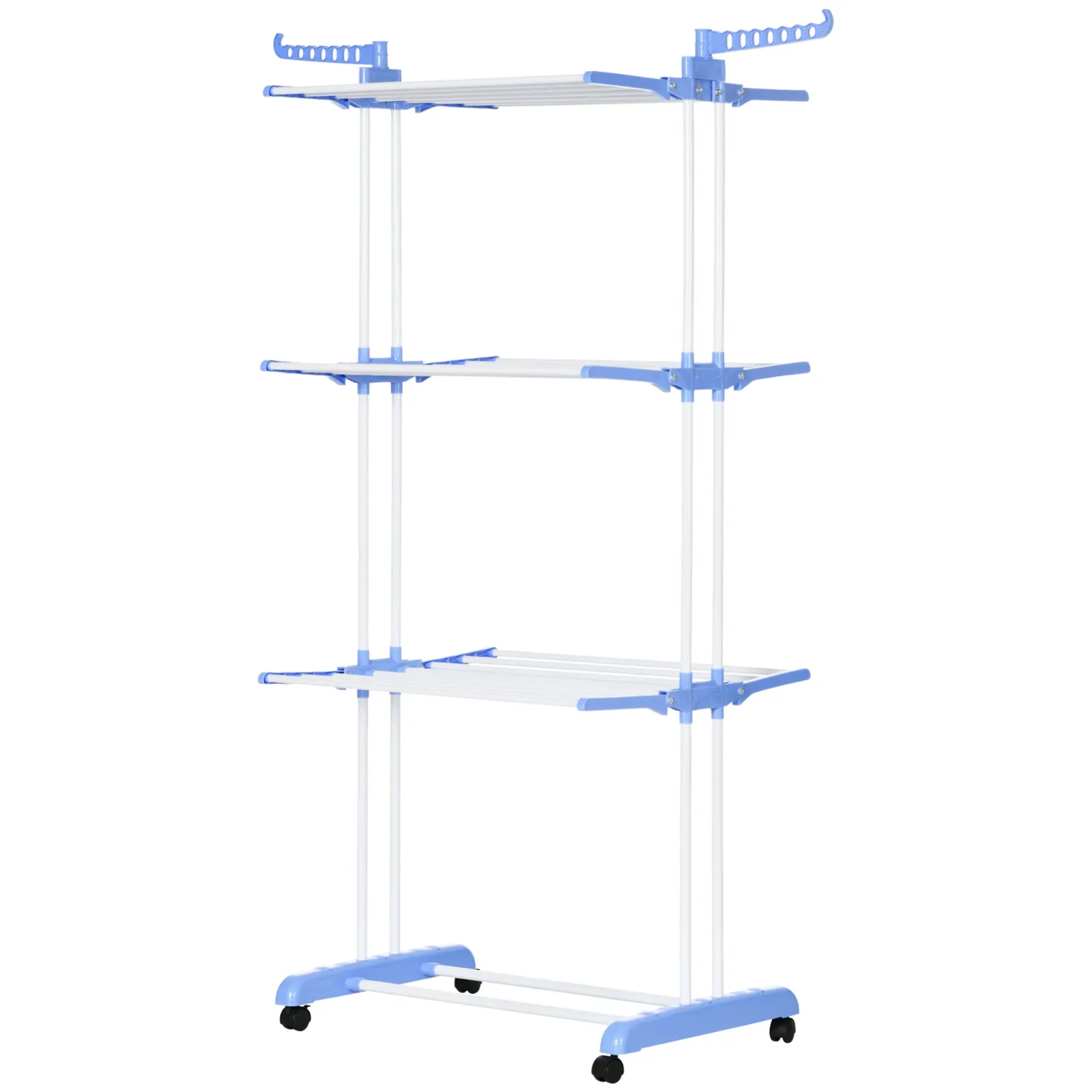 • 4-level rack with 2 wings Swivel lateral (14 hooks) that offer a large drying area for coats and socks and a lower rack for shoes • 4 swivel wheels to move it anywhere • Sturdy steel structure and anti -rust with quality plastic parts • usable in the room from bed, balcony and bathroom • Each shelf can be folded to meet your needs and fold it if not in use • Assembly required