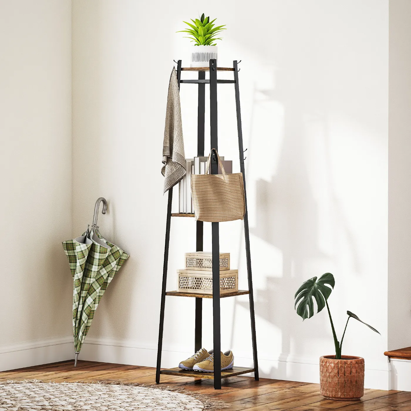 - VERSATILE SPACE: This innovative freestanding coat rack features eight double hooks, a three-tier shelf, and a top shelf, seamlessly integrating clothing hanging functionality and everyday small item storage solutions.