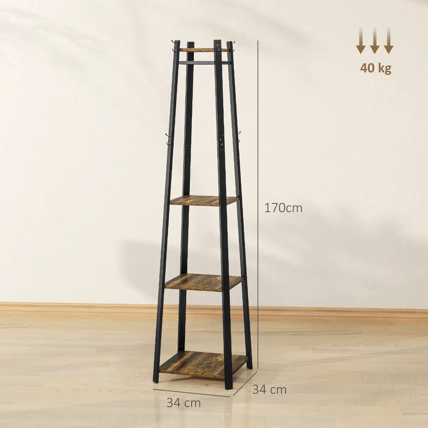 - DIMENSIONS: Overall dimensions: 34W x 34D x 170H cm. Weight capacity: 40kg (total), 5kg (shelf), 2kg (hook). Assembly required