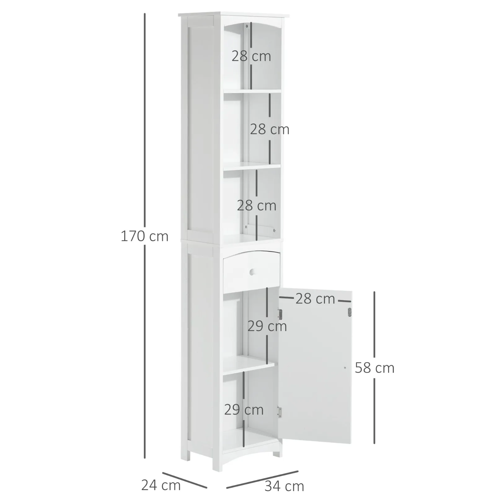 This Homcom bath cabinet is perfect for reorganizing all your accessories and always having them at hand! Built in white MDF panels, this furniture offers you ample space: 3 open shelves, 1 central drawer and 1 locker at the bottom. Styloso and functional, it is perfect for decorating your bathroom with taste! Features ● Bathroom cabinet, perfect for organizing all your accessories ● Spacious, with three open shelves, a central drawer and a cabinet in the lower part ● solid construction in panels of MDF finished with white paint ● The upper part is equipped with 3 open shelves, ideal for ornaments or cosmetics ● In the lower part there are a drawer and a locker with 2 internal shelves ● Assembly required technical ● Material: MDF ● color: white ● Maximum Single Bank load: 10 kg ● General dimensions: 34L x 24p x 170Acm ● Higher part – Single dimensions BOX: 28 L x 21.6 P x 28 A cm ● Dimensions: 24 l x 19.5 p x 12 a cm ● Dimensions Credenza Anta: 28 L x 58 A cm ● internal size belief (single shelf): 26 l x 29 at cm ● Open shelter height: 76.45 cm ● net weight: 12.7 kg