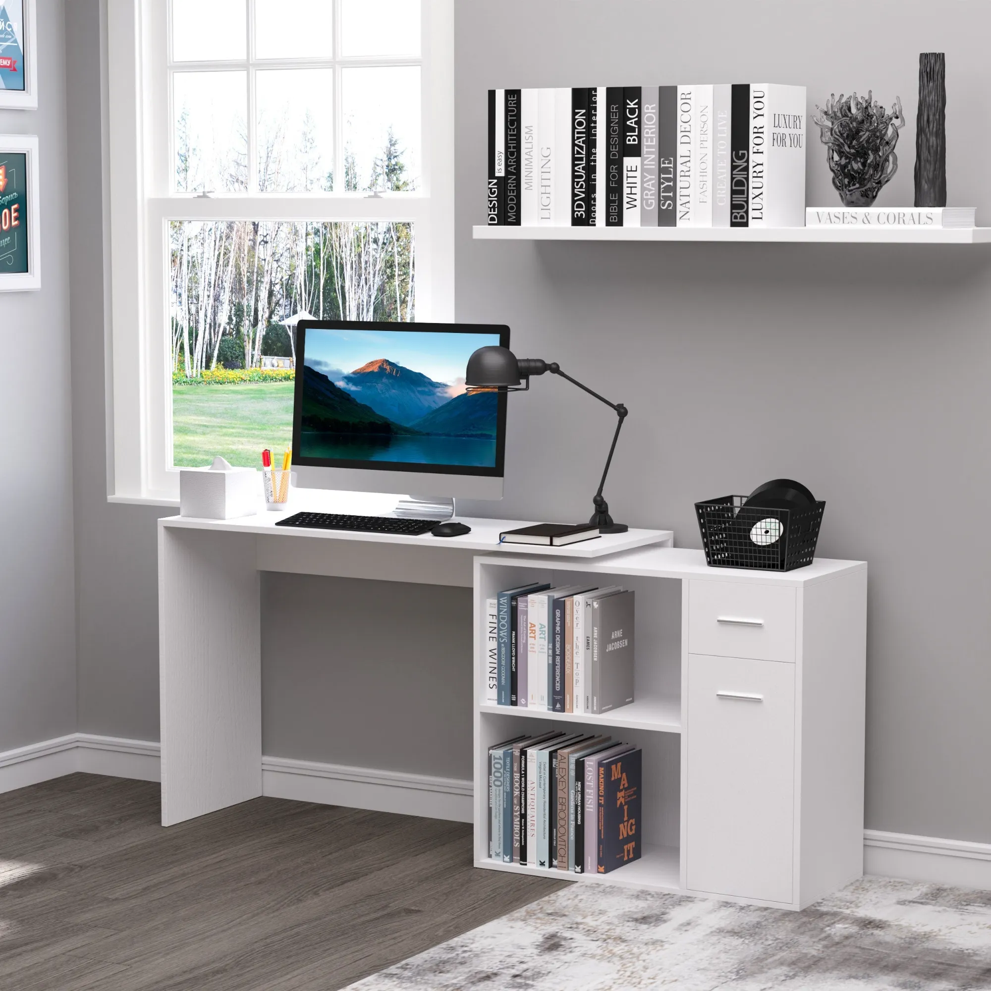 Transform your workspace in a snap with this Homcom corner desk! Constructed of chipboard panels with a scratch-resistant melamine surface, it’s easy to clean and keeps your space looking pristine. Rotate the work surface and shelf 360° to find the perfect angle for your tasks.