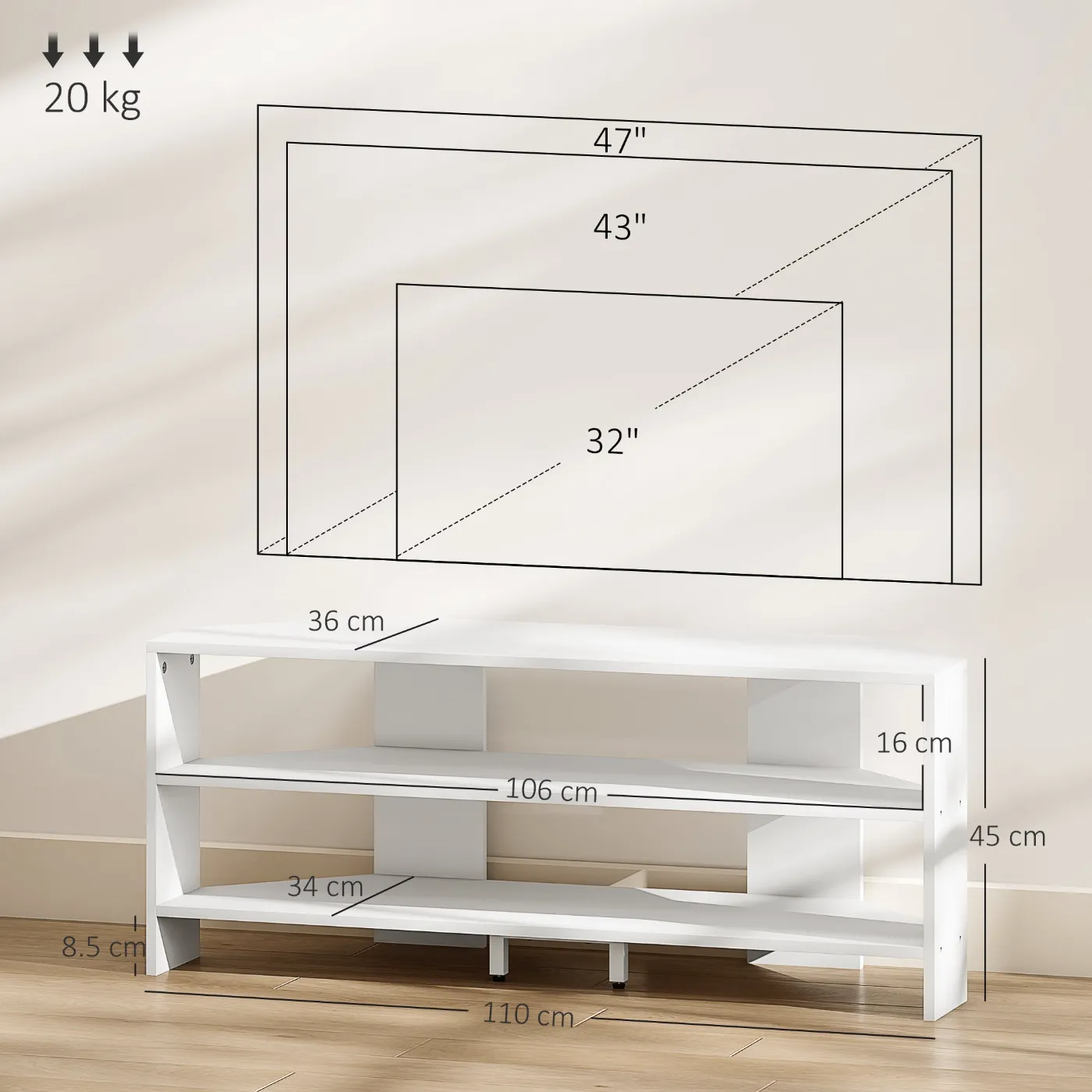 - DIMENSIONS: Overall dimensions: 110W x 36D x 45H cm. Weight capacity: 20 kg (total), 10 kg (shelf). Assembly required.