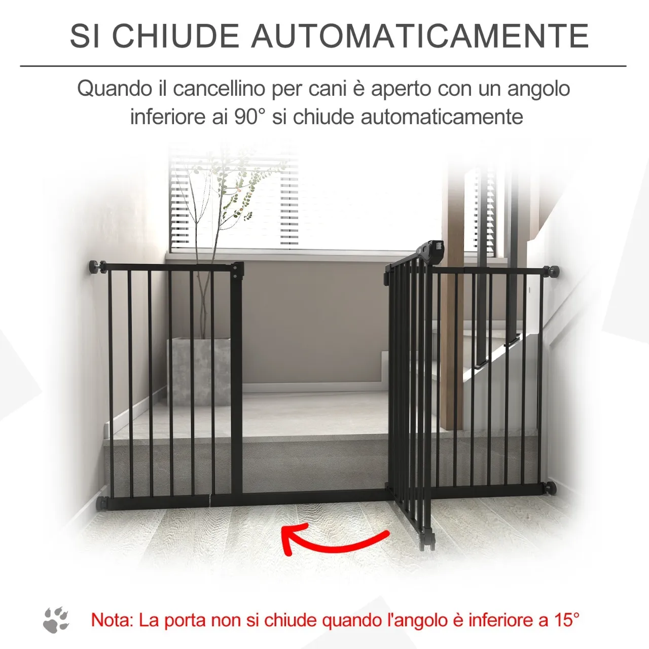 • INTELLIGENT MECHANISM: When the dog gate is opened at an angle less than 90° it closes automatically. If the gate is opened beyond 90° it remains open for greater convenience (it does not close when the angle is less than 15°).