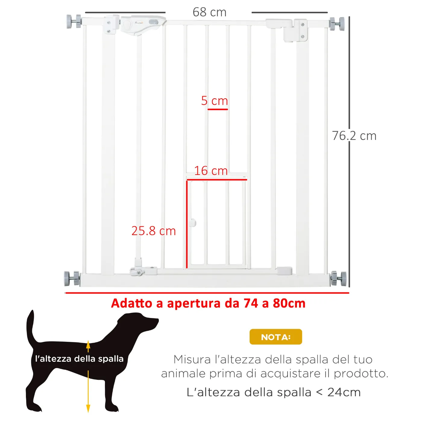 - DIMENSIONS: Overall dimensions: 68W x 76.2H cm. Our stair gate is only suitable for openings between 74 and 80 cm; please measure your opening before purchasing. Assembly required. Screws are required in dangerous areas such as stairs, while in other areas they can be omitted depending on the situation.