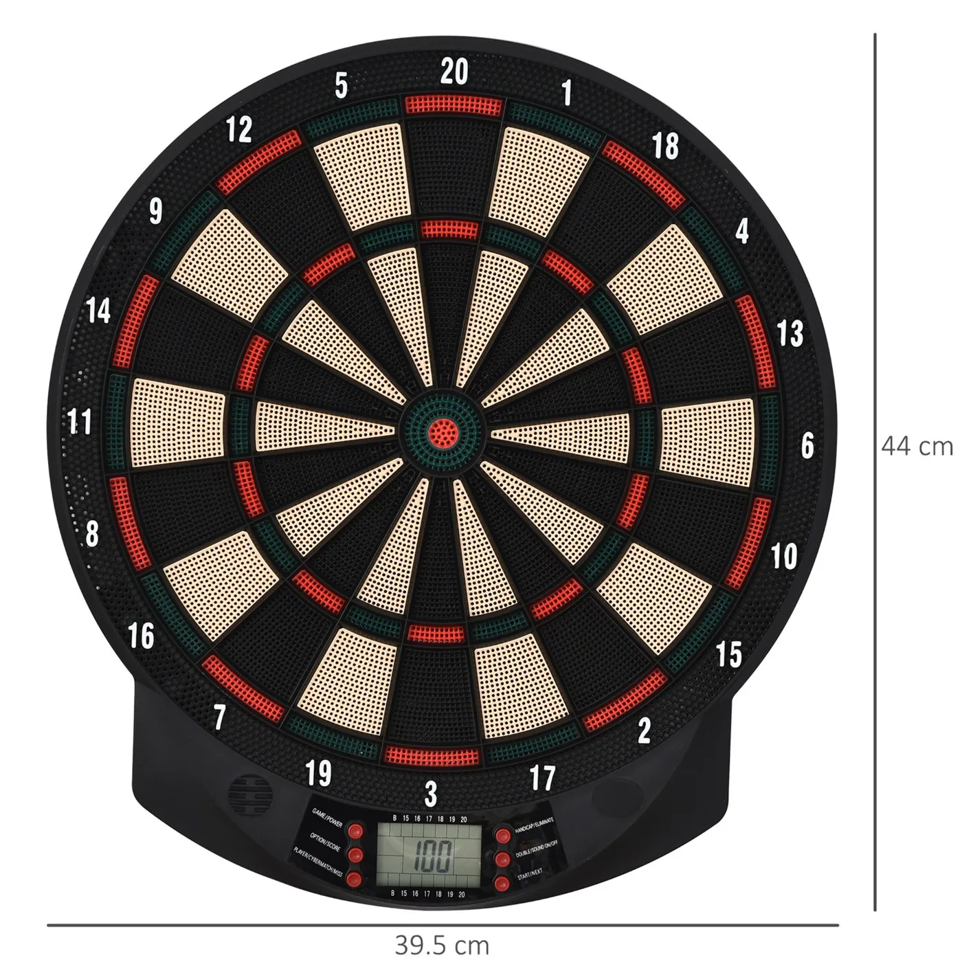 • DIMENSION: Overall Dimensions: 44L x 39.5D x 2.2H cm, 6 x 9.5g darts, 30 darts (powered by 3 x AA batteries).