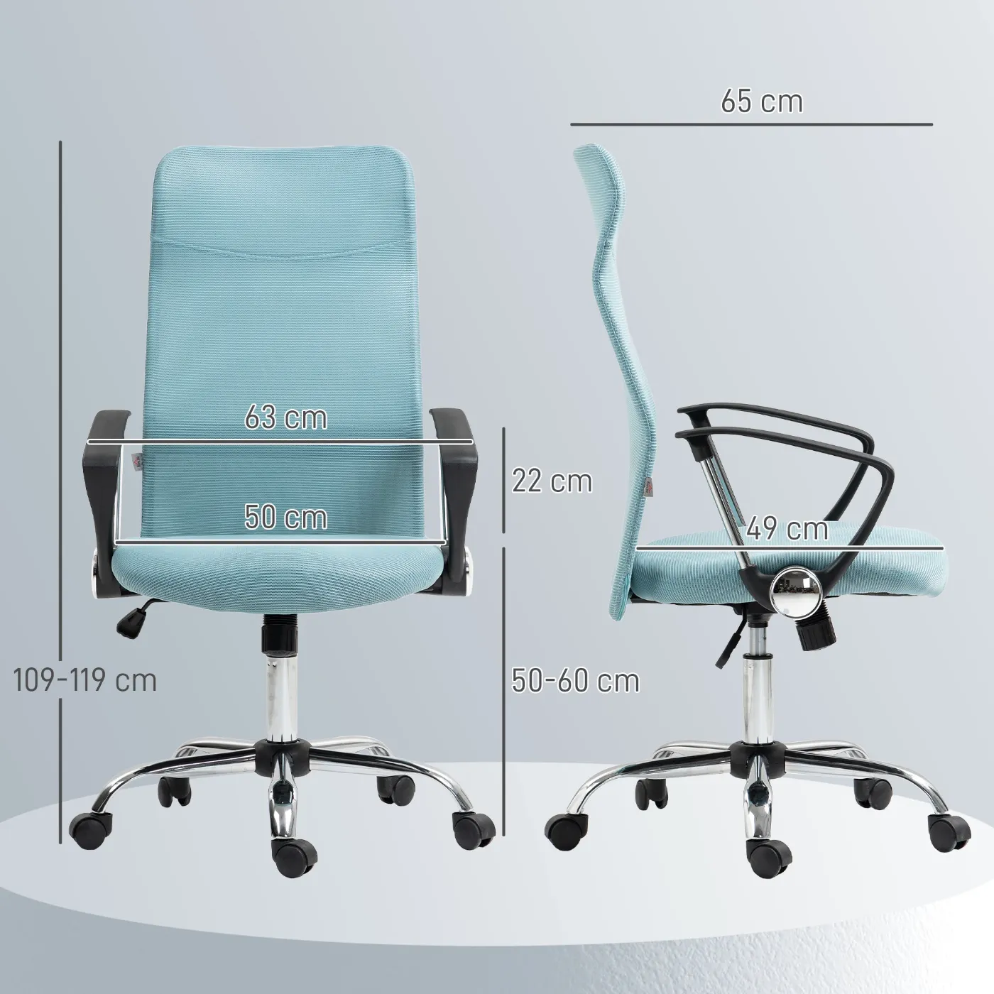 - DIMENSIONS: Overall dimensions: 63W x 65D x 109-119H cm. Seat dimensions: 50W x 49D x 50-60H cm. Maximum load: 120 kg