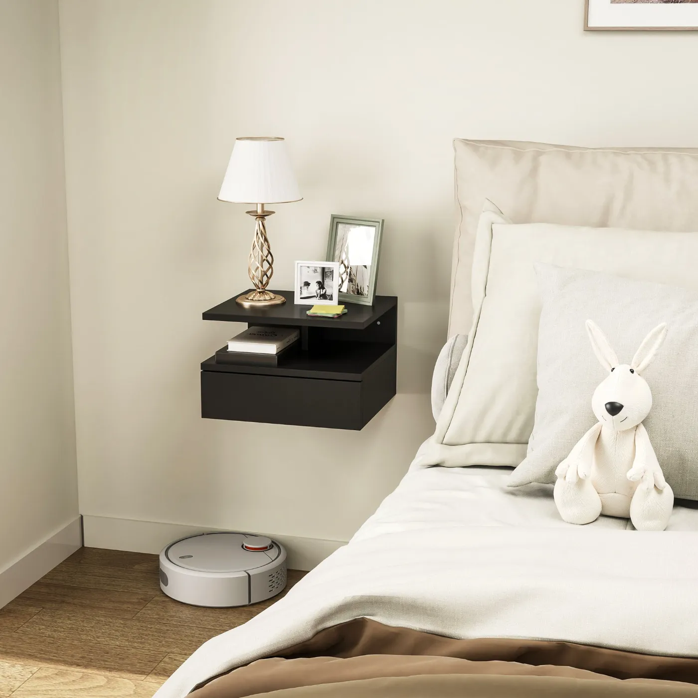 - DESIGN BEDSIDE TABLE: This floating bedside table has a modern and minimalist design, which perfectly matches different furnishing styles.