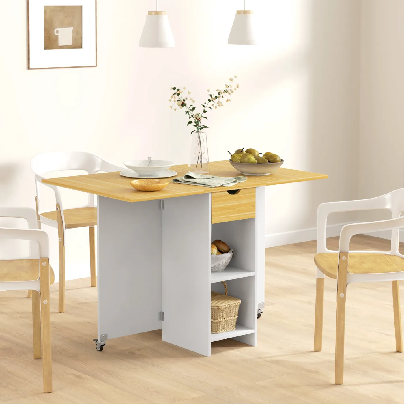 Folding Dining Table for 2-4 People with 2 Drop-Leafs, Drawer and Shelves, Oak