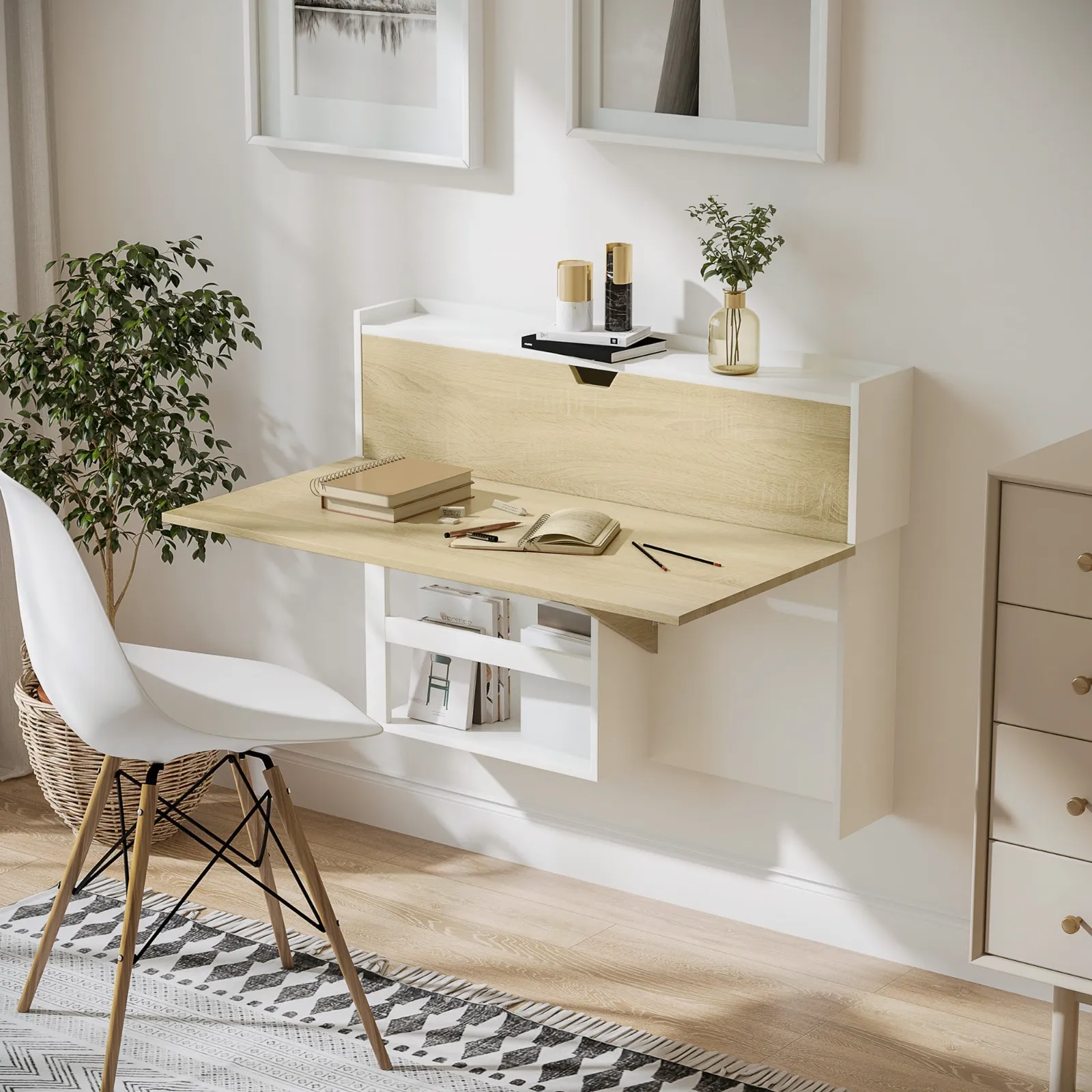 - LARGE AREA: This wall mounted desk offers a spacious work surface, while the different areas provide ample space for papers, books, pens, notebooks and many other items. In addition, the magnetic door design is very convenient for you to lower or raise the panel as you like.
