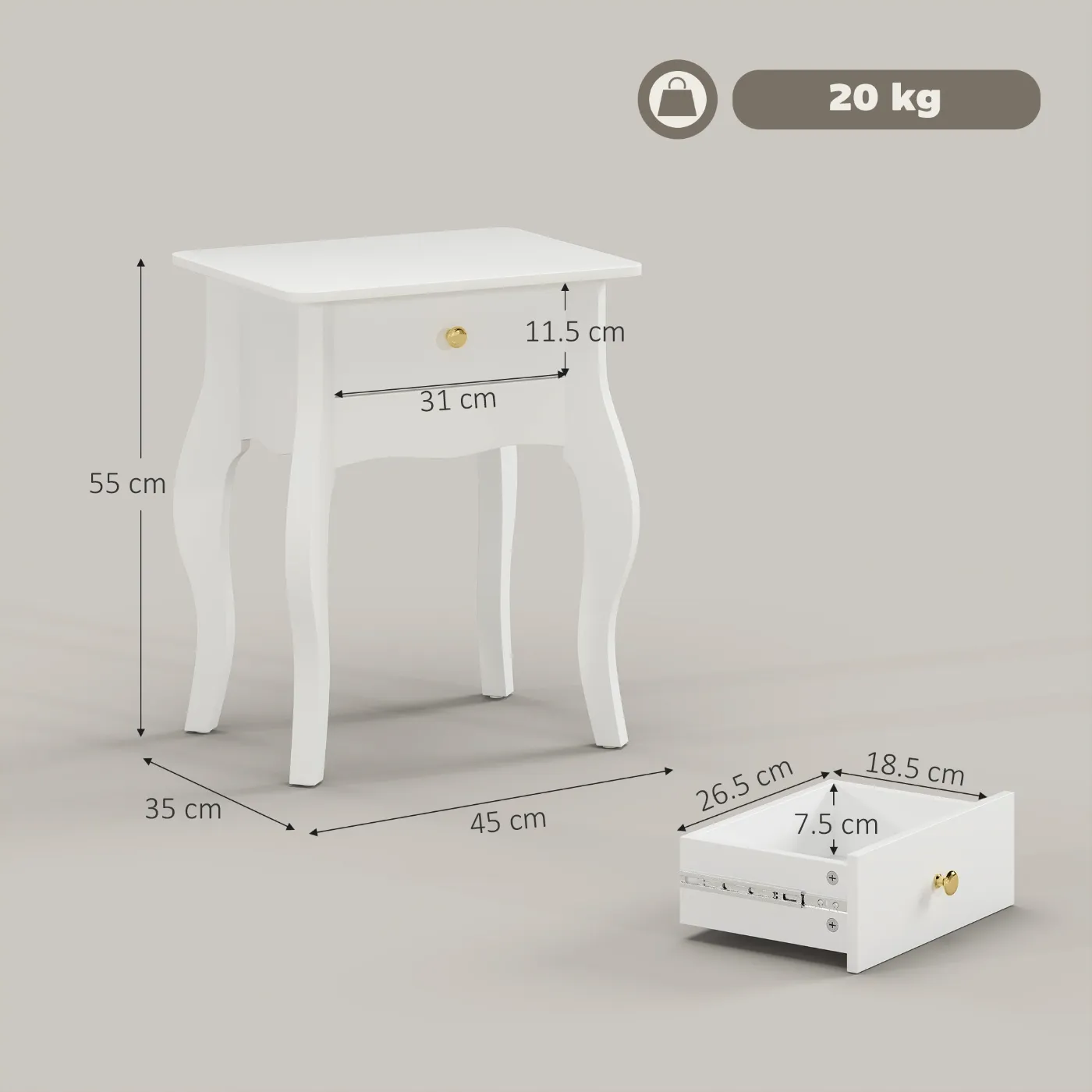 - • Weight capacity: 20 kg (total), 15 kg (top surface), 5 kg (drawer)
