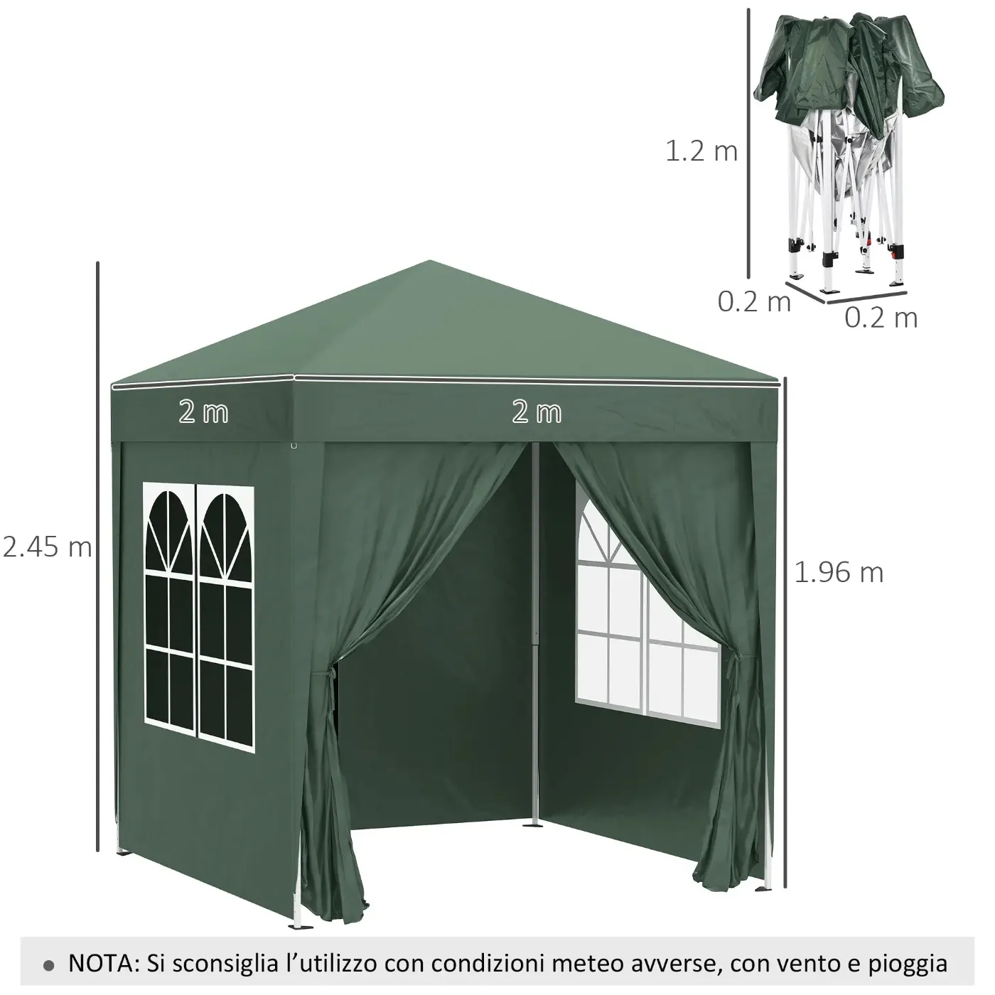 Gazebo 2×2 m Folding with 4 Removable Walls and Carry Bag, in Metal and Polyester, Green