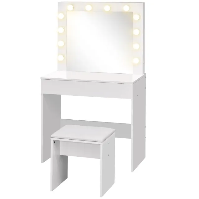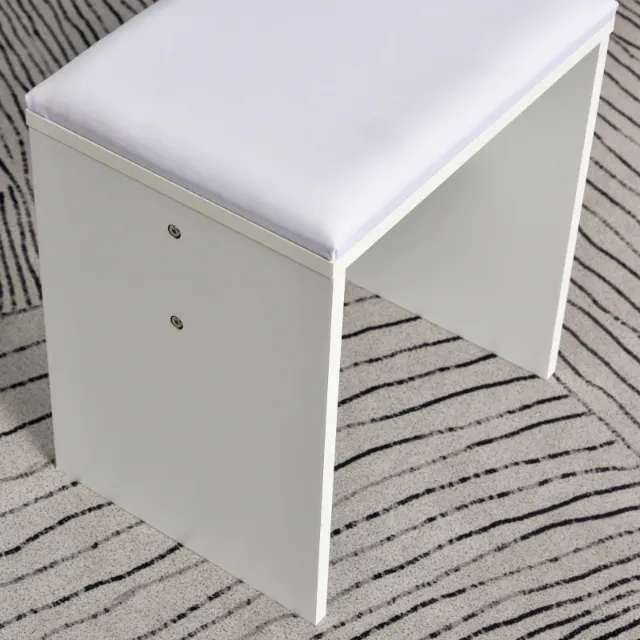 TABLE & STOOL: This makeup table is the dream of all beauty lovers! It has an illuminated mirror of 60.5P x 55.5Acm, a stool with upholstered seat and leatherette upholstery, and a large drawer with interior dimensions 72L x 29D x 8.5Hcm.