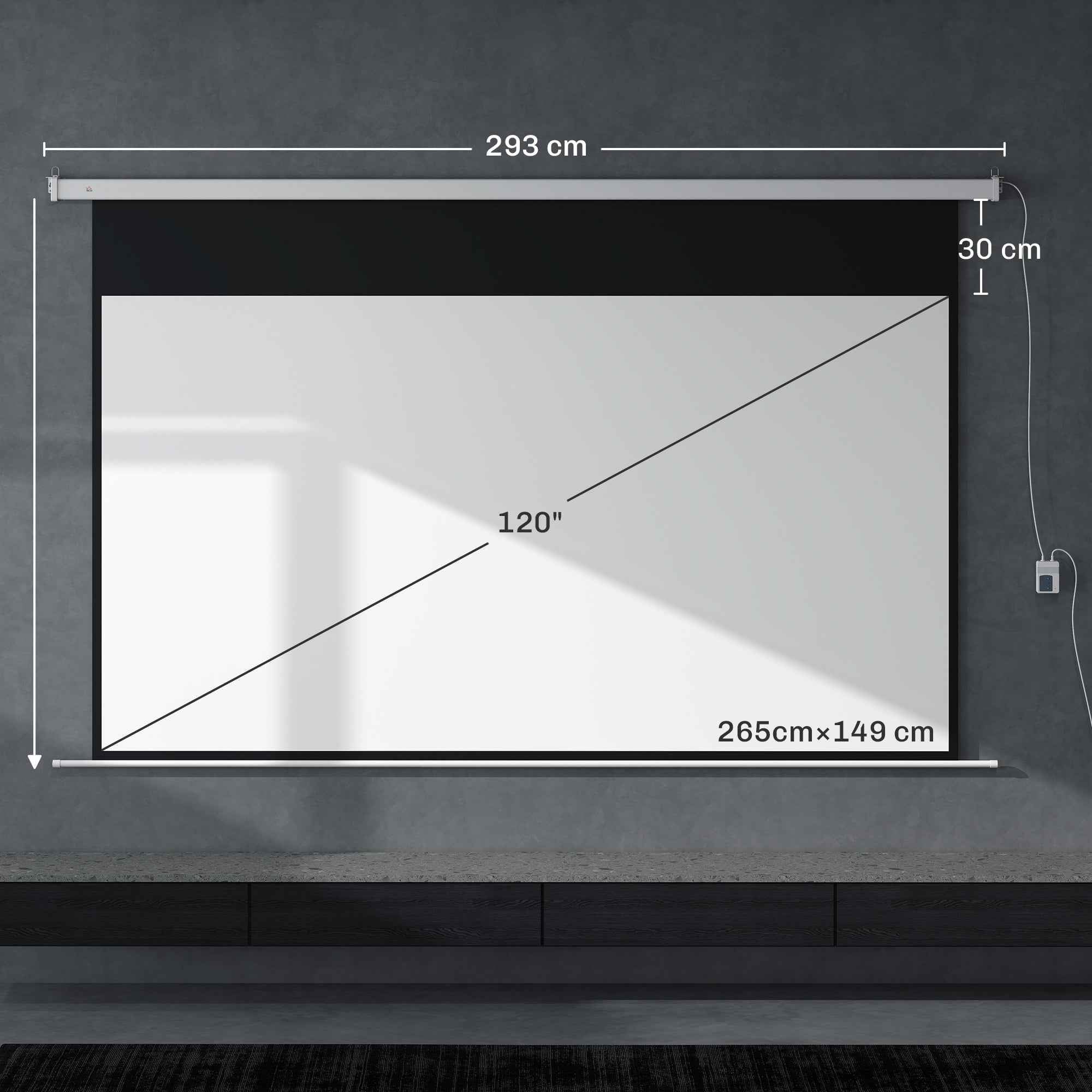 This HOMCOM projector screen can offer you an unprecedented viewing experience right in your home or office. What’s better than watching movies, series, and documentaries in HD quality on a big screen at home with friends? This projector screen is also ideal for broadcasting all your presentations during seminars or meetings in offices and classrooms at schools or universities. Features: • Motorized projection screen for easy wall or ceiling mounting, 16:9 format • 2 mounting options: wall and ceiling, to meet different needs • Infrared wireless remote control included for greater ease of use (30 m range) • Elegant white body and white projection surface • Projector screen designed and manufactured with sturdy materials for long-lasting use • Assembly required Technical data: • Color: White • Materials: Plastic, metal • Overall dimensions: 293W x 8D x 193H cm • Screen dimensions: 271W x 185H cm • Projection area: 265W x 149H cm • Aspect ratio: 16:9 • Body dimensions: 293W x 8D x 8H cm • Retraction speed: 15R/min • Border width: 150 mm black: 3 cm (left and right), 30 cm (top)• Rated voltage 230V/50HZ, Rated power 25W• CE certified (EMC, LVD, RED, ERP, RoHS)Package contents:• 1 x Projector screen• 1 x Assembly required