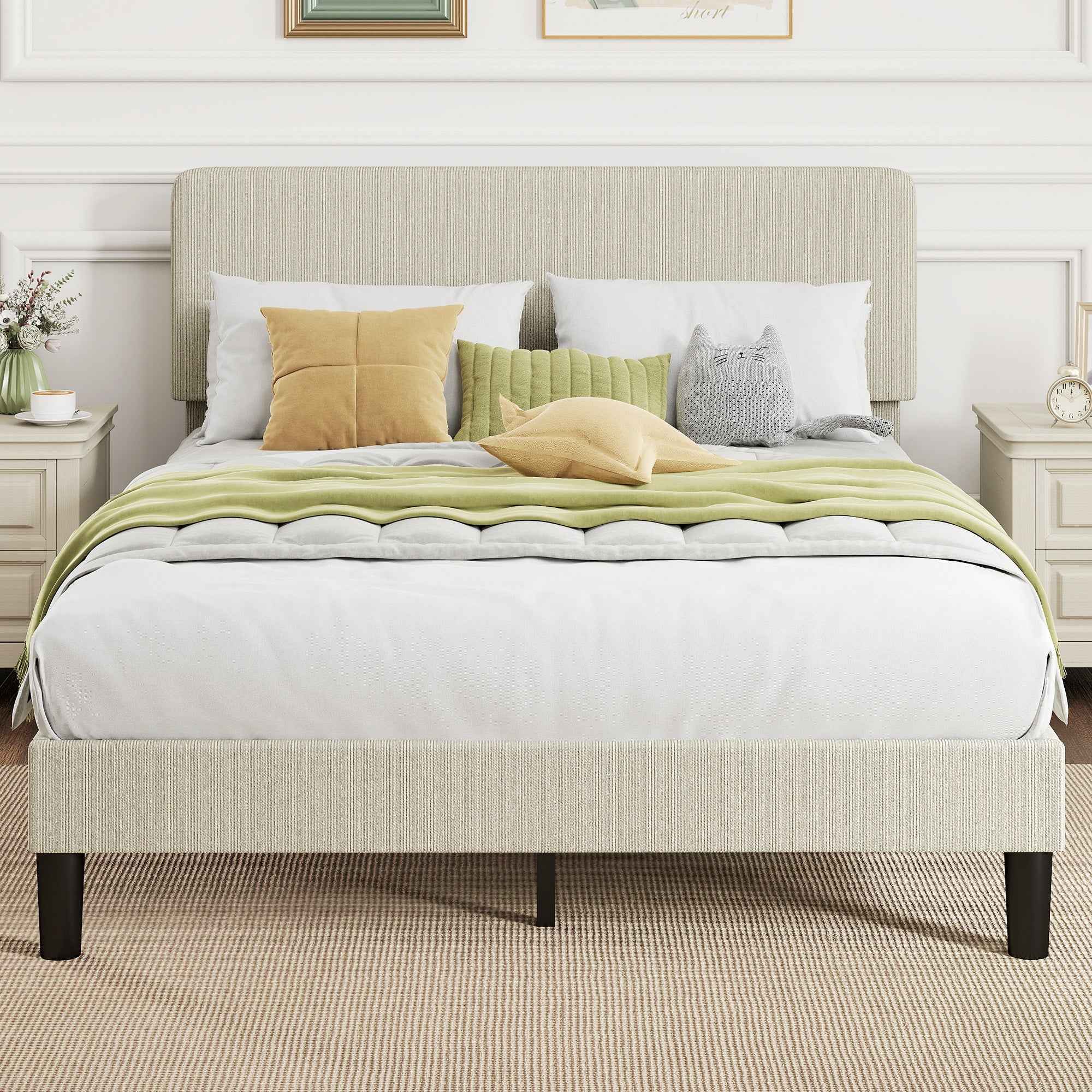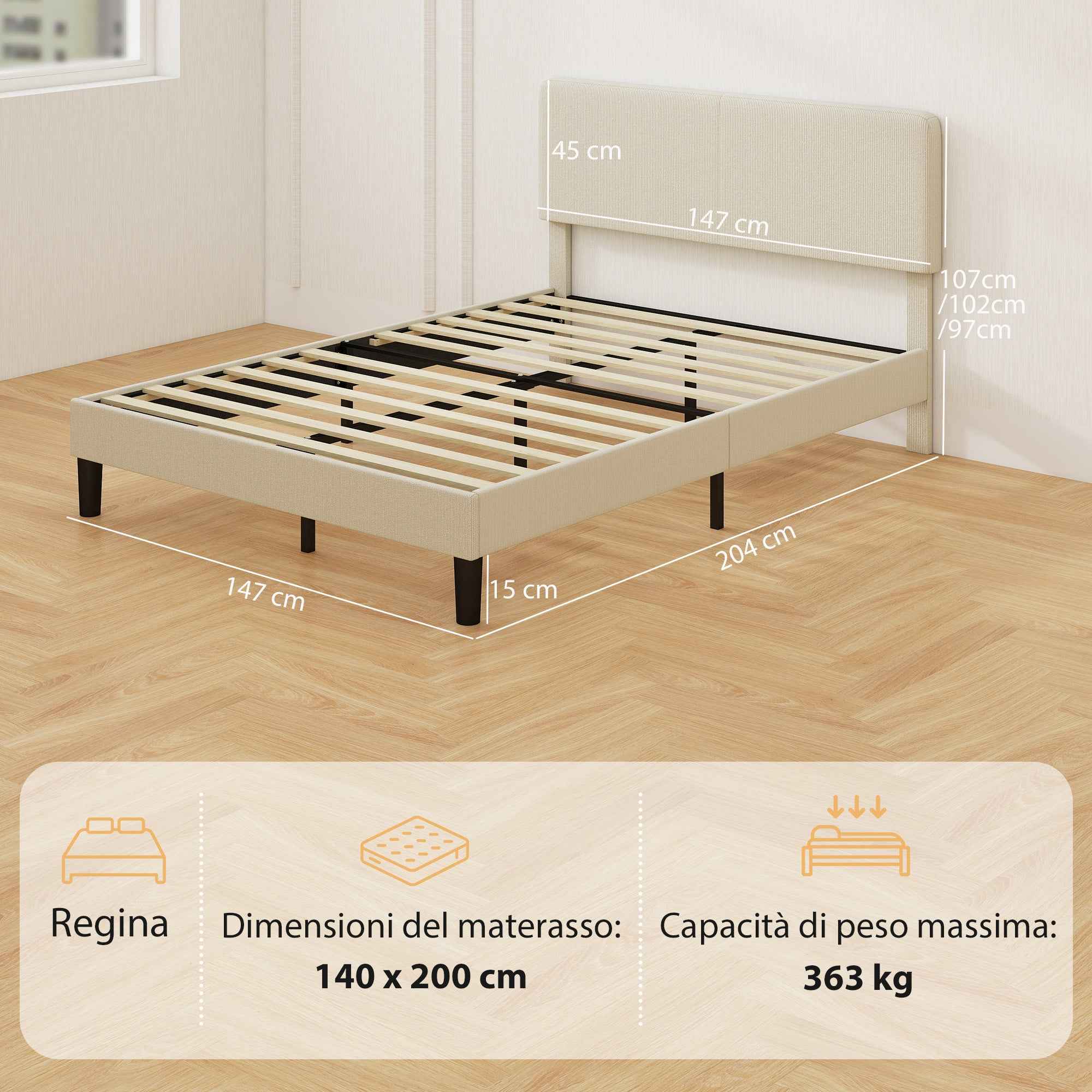 The HOMCOM bed frame combines comfort, durability, and understated elegance. The adjustable padded headboard offers three height options to suit your mattress and your preferences, while the corduroy upholstery adds warmth and charm. Supported by 12 plywood slats and metal legs, the bed supports up to 800 lbs, ensuring a peaceful night’s sleep. With 15 cm of floor clearance for cleaning and noise-reducing pads, it offers peaceful nights and easy maintenance. Features: • Adjustable headboard offers three height options for personalized comfort • Corduroy upholstery adds cozy warmth to any bedroom decor • Bed frame with 12 plywood slats and metal legs that safely support up to 800 lbs • 15 cm of under-bed clearance allows easy access for cleaning with a robot vacuum • Velcro slats with EVA pads ensure a peaceful, noise-free sleep • Non-slip feet protect floors and reduce movement during use • Reliable wooden slats support latex, memory foam, or innerspring mattresses without the need for additional bases • Assembly required Technical data: • Color: Light gray • Material: Corduroy (100% Polyester), sponge, plywood, metal • Overall dimensions: 147L x 204D x 107H cm • Suitable mattress size: 140L x 200D cm• Adjustable headboard height: 97 cm/102 cm/107 cm• Clearance under the bed: 15 cm• Maximum weight capacity: 363 kgPackage contents:• 1 x Bed frame• 1 x Manual