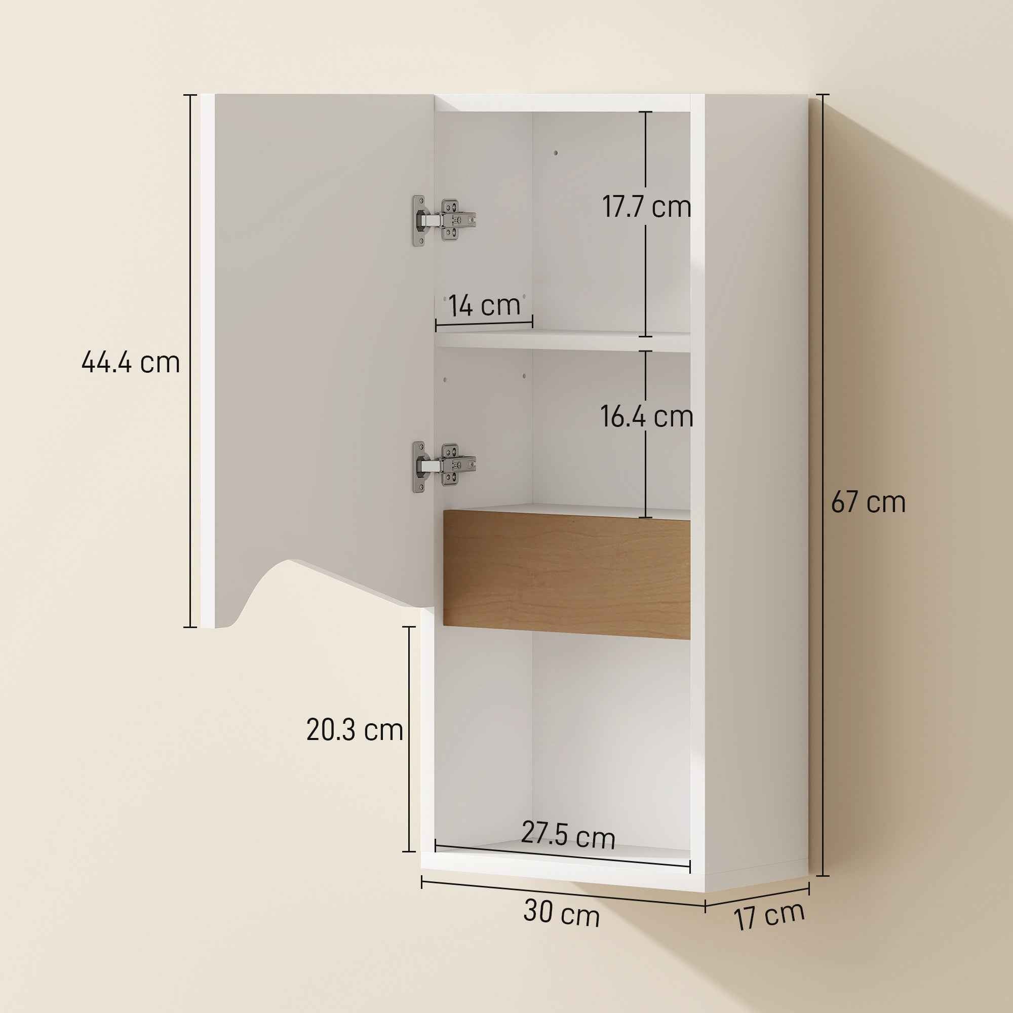 Optimize the style and efficiency of your bathroom with our HOMCOM bathroom cabinet! Take advantage of its open shelf and adjustable shelf to create a tidy and peaceful environment, especially thanks to the silent and soft-close door. The compact design makes any wall an elegant and practical solution for storing your essentials, keeping them organized even in the smallest bathroom. Features: • Bathroom wall cabinet with an open shelf and a cabinet with adjustable shelf • Bathroom cabinet equipped with cushioned hinges that ensure the door closes silently and gently • Uses wall space to save precious floor space • Bathroom cabinet made of sturdy chipboard with a melamine finish for durability and easy cleaning • Assembly required Technical data: • Color: White, natural wood • Material: Chipboard • Overall dimensions: 30W x 17D x 67H cm • Open shelf dimensions: 27.5W x 14D x 20.3H cm • Internal space of the cabinet: 27.5W x 14D x 35.4H cm • Weight capacity: 8 kg (total), 2 kg (countertop/shelf) Package contents: • 1 x Bathroom wall cabinet • 1 x Assembly manual